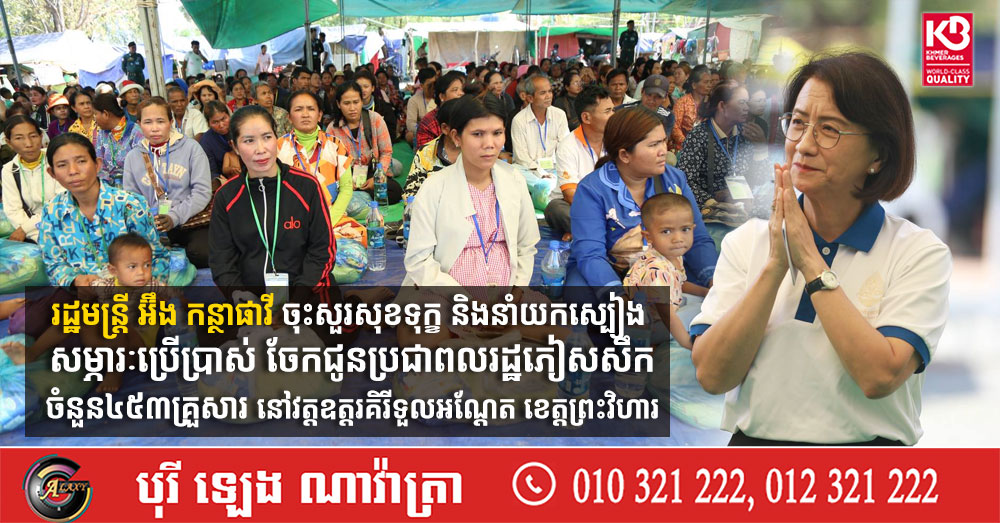 រដ្ឋមន្ត្រី អ៊ឹង កន្ថាផាវី ចុះសួរសុខទុក្ខ និងនាំយកស្បៀង សម្ភារៈប្រើប្រាស់ ចែកជូនប្រជាពលរដ្ឋភៀសសឹកចំនួន៤៥៣គ្រួសារ នៅវត្តឧត្តរគិរីទួលអណ្តែត ខេត្តព្រះវិហារ