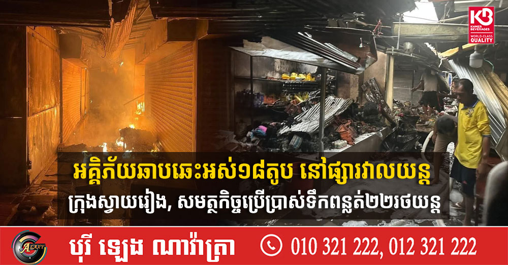(ស្វាយរៀង)៖ មានករណីអគ្គិភ័យឆាបឆេះតូបលក់ដូរអីវ៉ាន់ចាប់ហួយ និងគ្រឿងក្រអូប របស់អាជីវករផ្សារវាលយន្ត ក្រុងស្វាយរៀង ចំនួន១៨តូប និងខូចខាតសម្ភារៈអស់មួយចំនួនធំ។