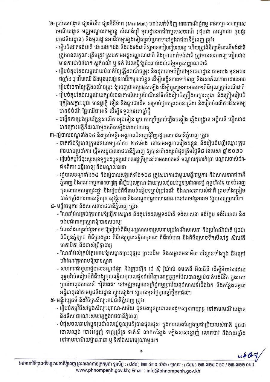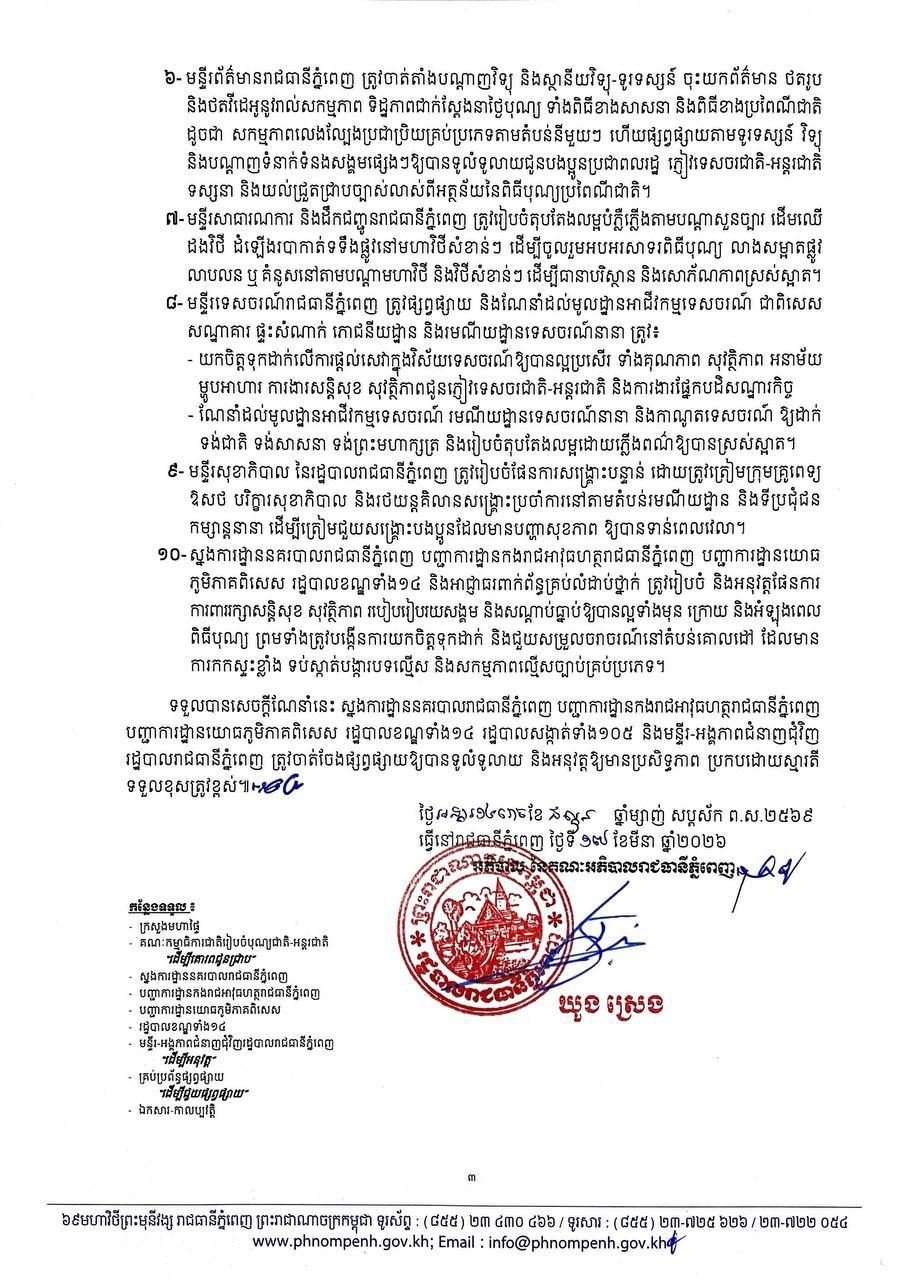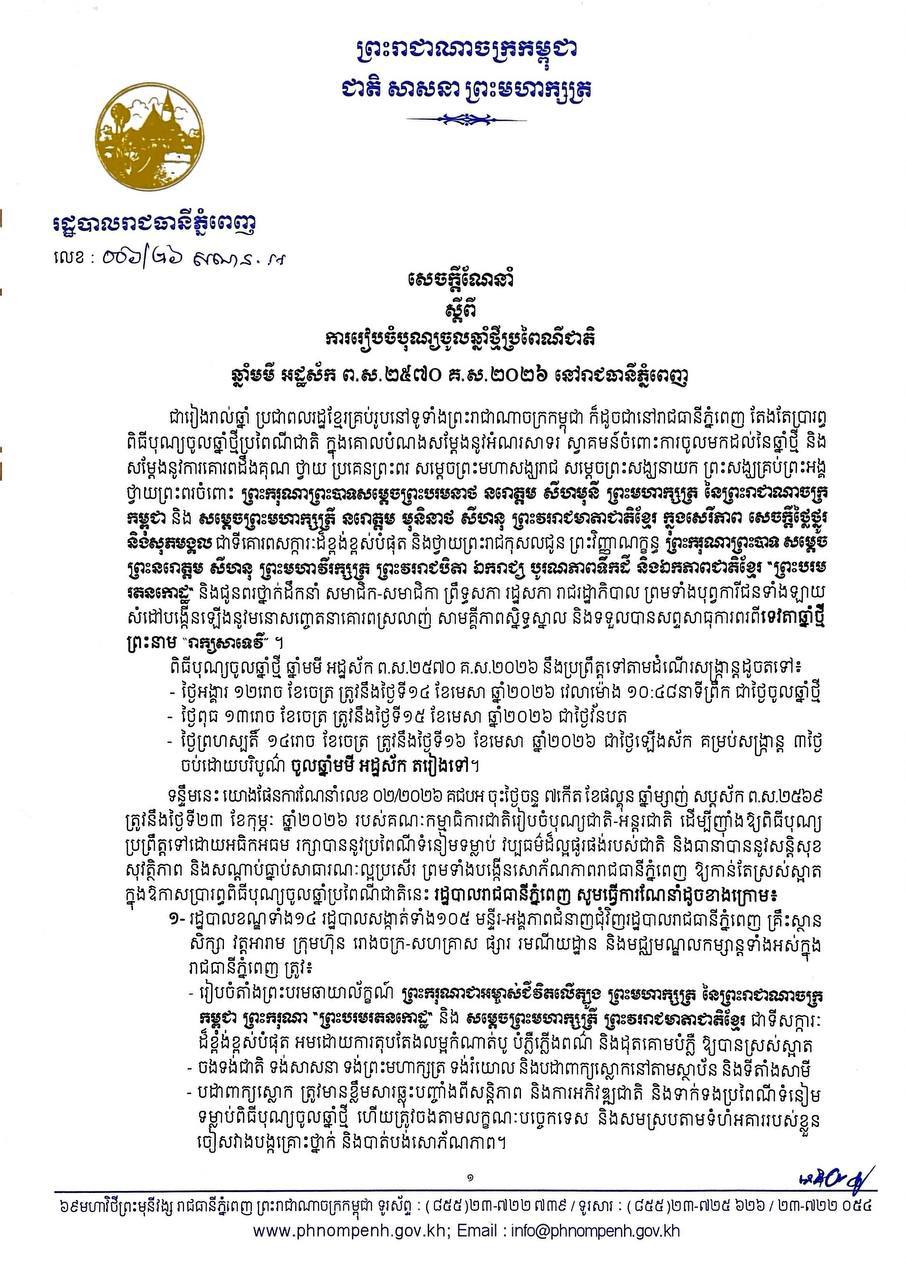រដ្ឋបាលរាជធានីភ្នំពេញ ចេញសេចក្តីណែនាំស្តីពីការរៀបចំបុណ្យចូលឆ្នាំថ្មីប្រពៃណីជាតិ ឆ្នាំមមី អដ្ឋស័ក ព.ស.២៥៧០ គ.ស.២០២៦