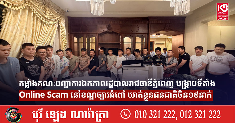 កម្លាំងគណៈបញ្ជាការឯកភាពរដ្ឋបាលរាជធានីភ្នំពេញ បង្ក្រាបទីតាំង Online Scam នៅខណ្ឌច្បារអំពៅ ឃាត់ខ្លួនជនជាតិចិន១៩នាក់
