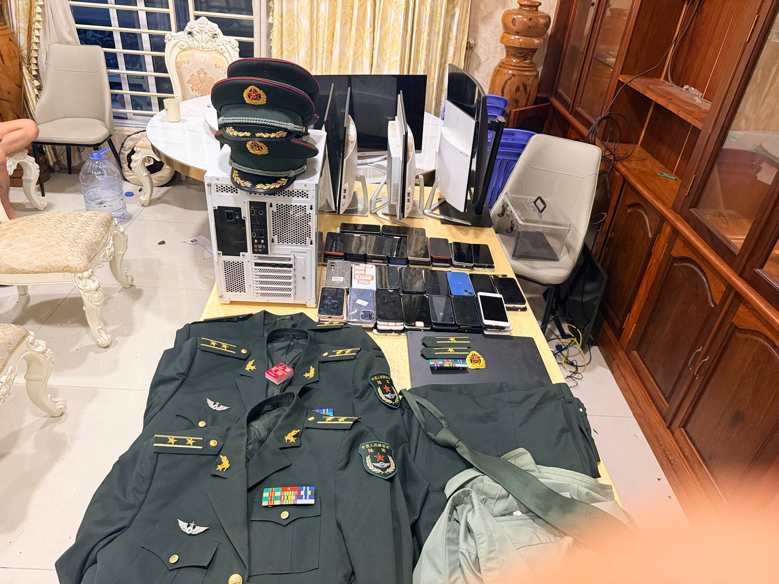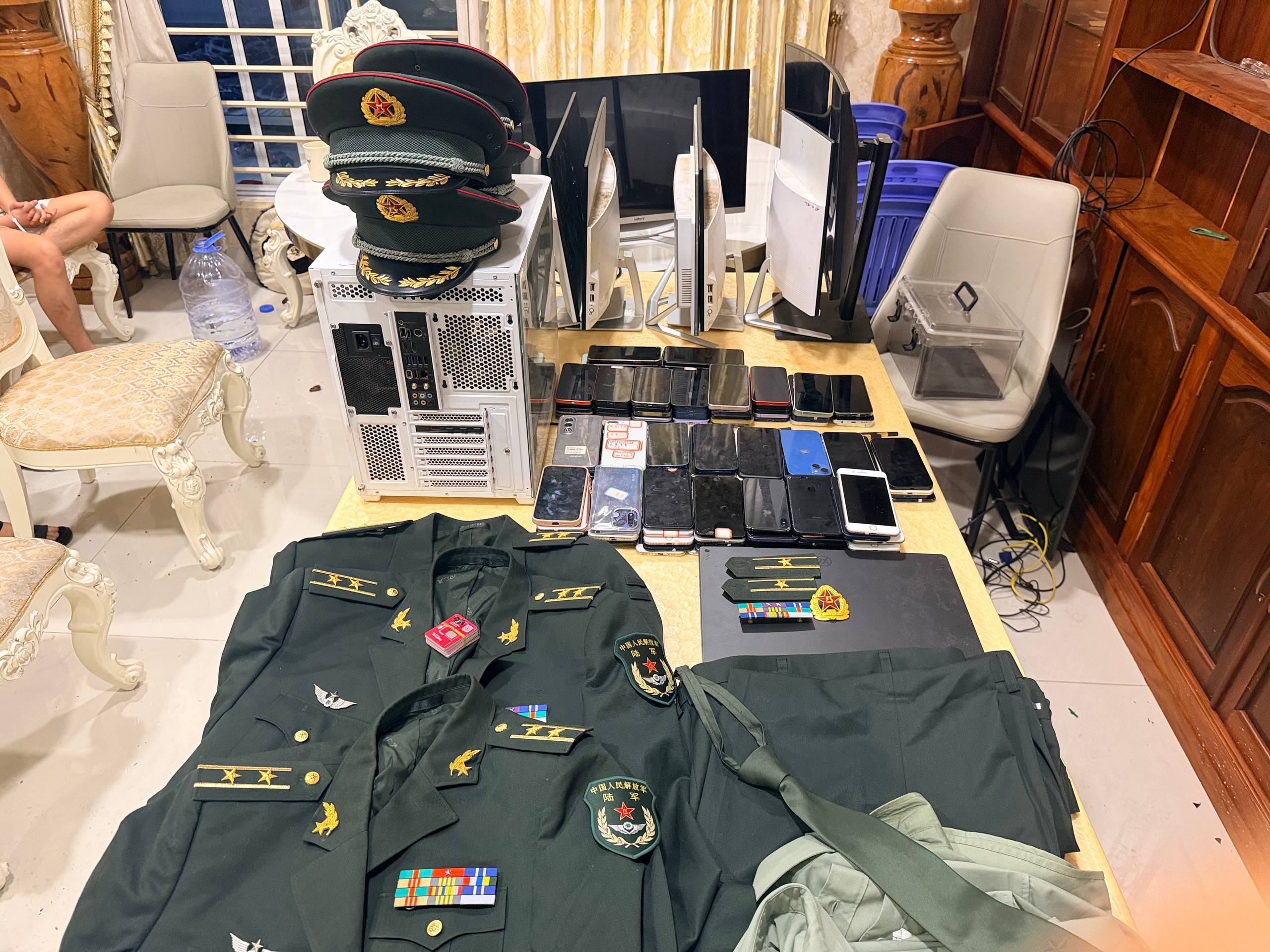 ក្នុងនោះក្រុមការងារបានត្រួតពិនិត្យរកឃើញមនុស្ស ចំនួន១៩នាក់ ជាជនជាតិចិន និងដកហូតសម្ភារៈ ទូរស័ព្ទដៃ ចំនួន១២៣គ្រឿង, កុំព្យូទ័រយួរដៃ ចំនួន១គ្រឿង, ធុង CPU ចំនួន១គ្រឿង, កុំព្យូទ័រ All in One ចំនួន៨គ្រឿង, ម៉ូនីទ័រចំនួន២គ្រឿង, មួកសមត្ថកិច្ចចិនចំនួន៤, អាវសមត្ថកិច្ចចិនលេវមាស ចំនួន៣, ខោពណ៌បៃតងចាស់ ចំនួន៣, អាវសាច់ក្រណាត់ពណ៌បៃតងខ្ចី ចំនួន៣, ក្រវ៉ាត់ក ពណ៌បៃតងចាស់ ចំនួន១។