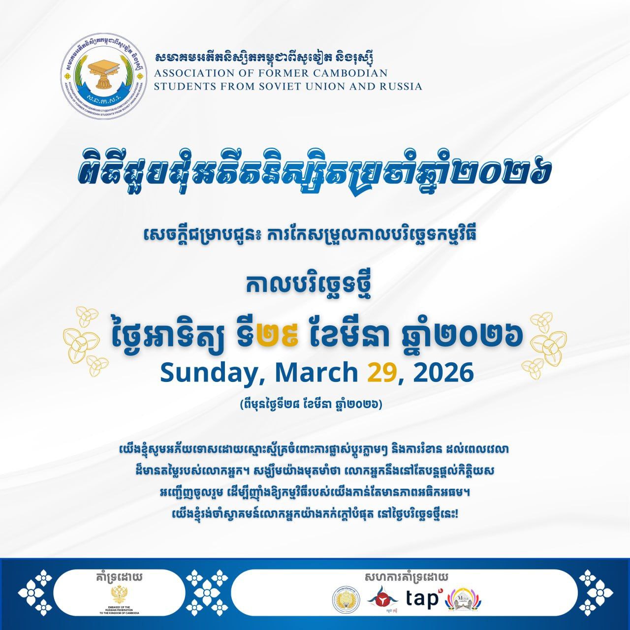 (ភ្នំពេញ)៖ សមាគមអតីតនិស្សិតកម្ពុជាពីសូវៀត និងរុស្ស៊ី បានជូនដំណឹងអំពីការបរិច្ចេទថ្មីនៃការជួបជុំអតីតនិស្សិតកម្ពុជាពីសូវៀត និងរុស្ស៊ី នៅថ្ងៃទី២៩ ខែមីនា ឆ្នាំ២០២៦វិញ យោងតាមសំណូមពរពី លោក Anatoly Borovik អគ្គរដ្ឋទូតរុស្ស៊ីប្រចាំកម្ពុជា។