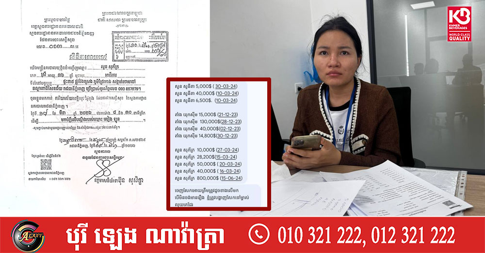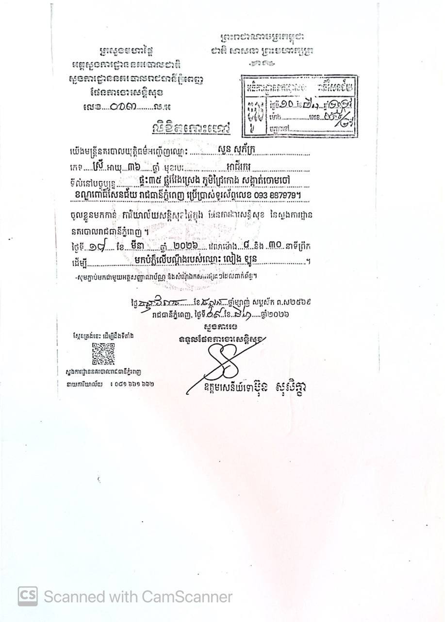 ស្នងការដ្ឋាននគរបាលរាជធានីភ្នំពេញ កោះហៅស្ដ្រីម្នាក់ដែលក្លែងឯកសារ និងបន្លំស្នាមមេដៃអ្នកដទៃរឿងខ្ចីលុយ និងដាក់បញ្ចាំទ្រព្យសម្បត្តិ មកសួរនាំ ដើម្បីចាត់ការតាមច្បាប់