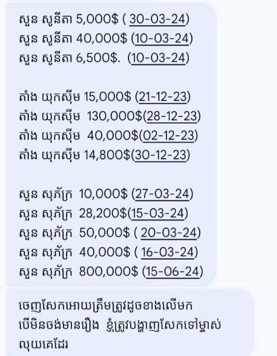យោងតាមកំណត់មួយបក្ខពួកដែលនៅពីក្រោយខ្នងរបស់ស្រ្តីឈ្មោះ សួន សុភ័ក្រ បានបង្ខំឲ្យជនរងគ្រោះចេញសែកទៅឈ្មោះ សួន សូនីតា ចំនួន៣សន្លឹក, ទៅឈ្មោះ តាំង យុកសឹម ចំនួន៤សន្លឹក និងឈ្មោះរបស់ខ្លួន (សួន សុភ័ក្រ) ចំនួន៥សន្លឹក សរុបជាទឹកប្រាក់រហូតដល់លានដុល្លារ ក្នុងគោលបំណងទុកជាភស្តុតាងចាត់វិធានការតាមច្បាប់។