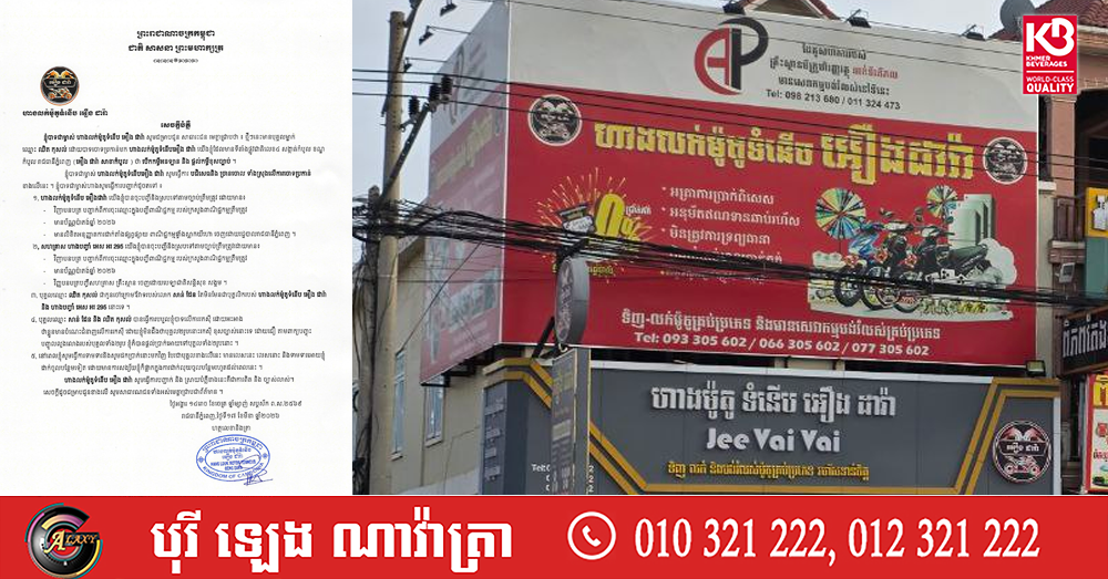 - មានលិខិតអនុញ្ញាតការដាក់តាំងផ្សព្វផ្សាយពាណិជ្ជកម្មផ្ទាំងស្លាកយីហោ ចេញដោយរដ្ឋបាលរាជធានីភ្នំពេញ។