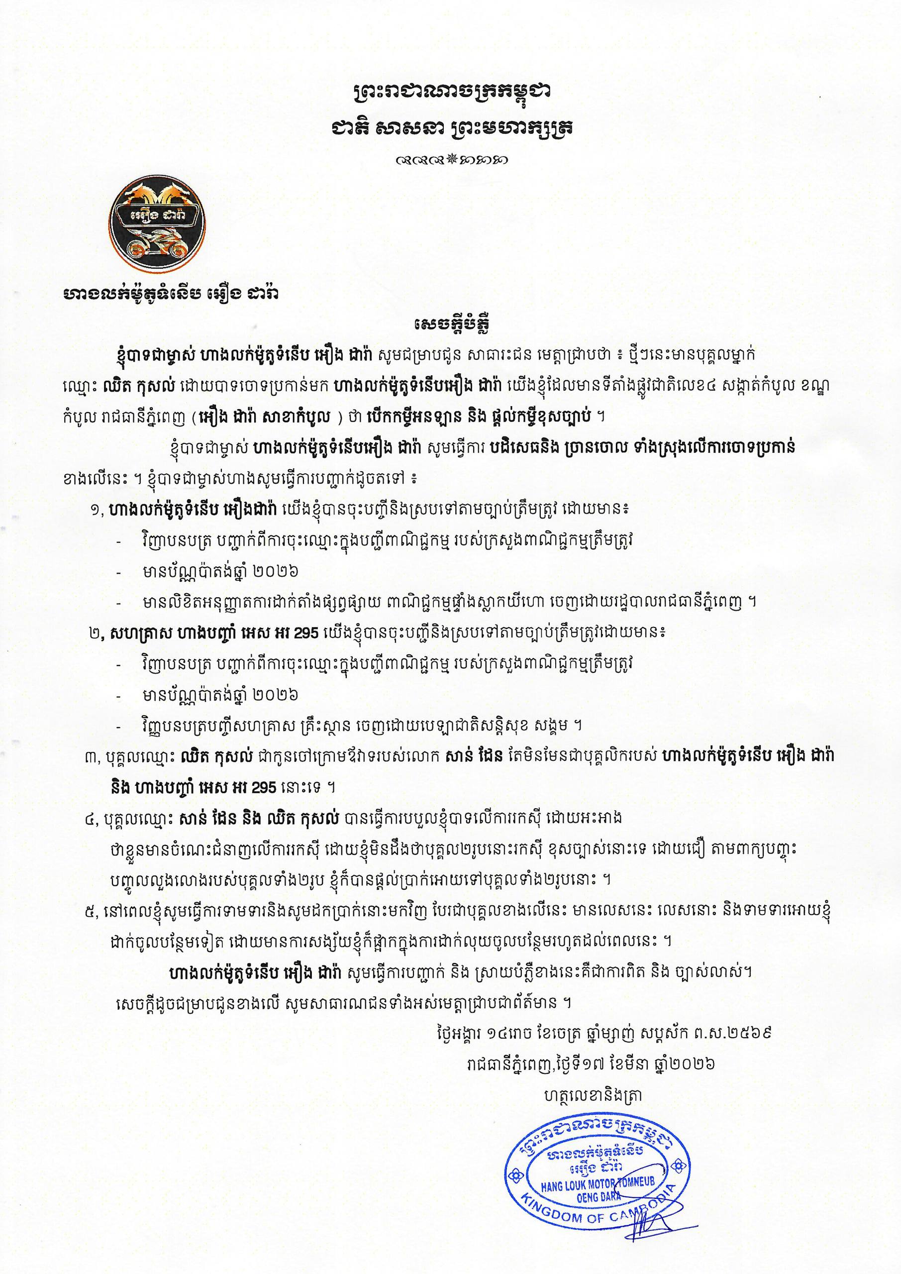 (ភ្នំពេញ)៖ លោក អ៉ឹម ច័ន្ទដារ៉ា ជាម្ចាស់ហាងលក់ម៉ូតូទំនើប អឿង ដារ៉ា និងហាងបញ្ចាំ SR295 បានចេញមុខមកអះអាងថា លោកមិនជាប់ពាក់ព័ន្ធនឹងអាជីវកម្មផ្តល់កម្ចីខុសច្បាប់នោះឡើយ។