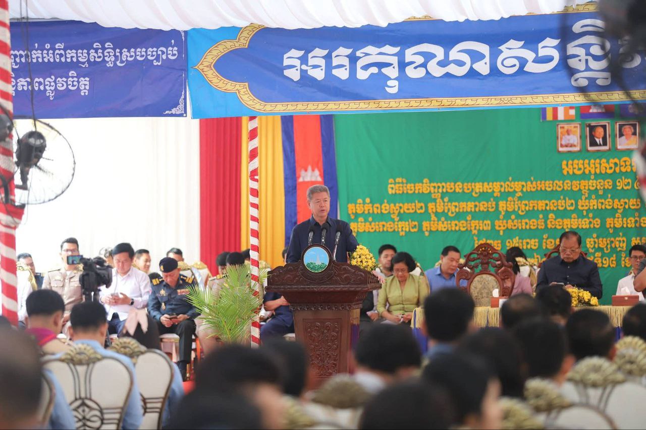 ថ្លែងក្នុងពិធីនេះលោក គួច ចំរើន បានកោតសរសើរមន្ត្រីភូមិបាល អាជ្ញាធរស្រុក ភូមិ-ឃុំទាំងអស់ ដែលខិតខំយកចិត្តទុកដាក់ខ្ពស់ក្នុងដំណើរការវាស់វែង ចុះបញ្ជី និងបិទផ្សព្វផ្សាយ តាំងពីពេលចាប់ផ្តើមរហូតឈានដល់ការ ចែកប័ណ្ណជូនប្រជាពលរដ្ឋនាថ្ងៃនេះ។