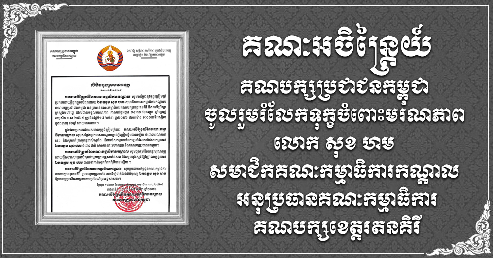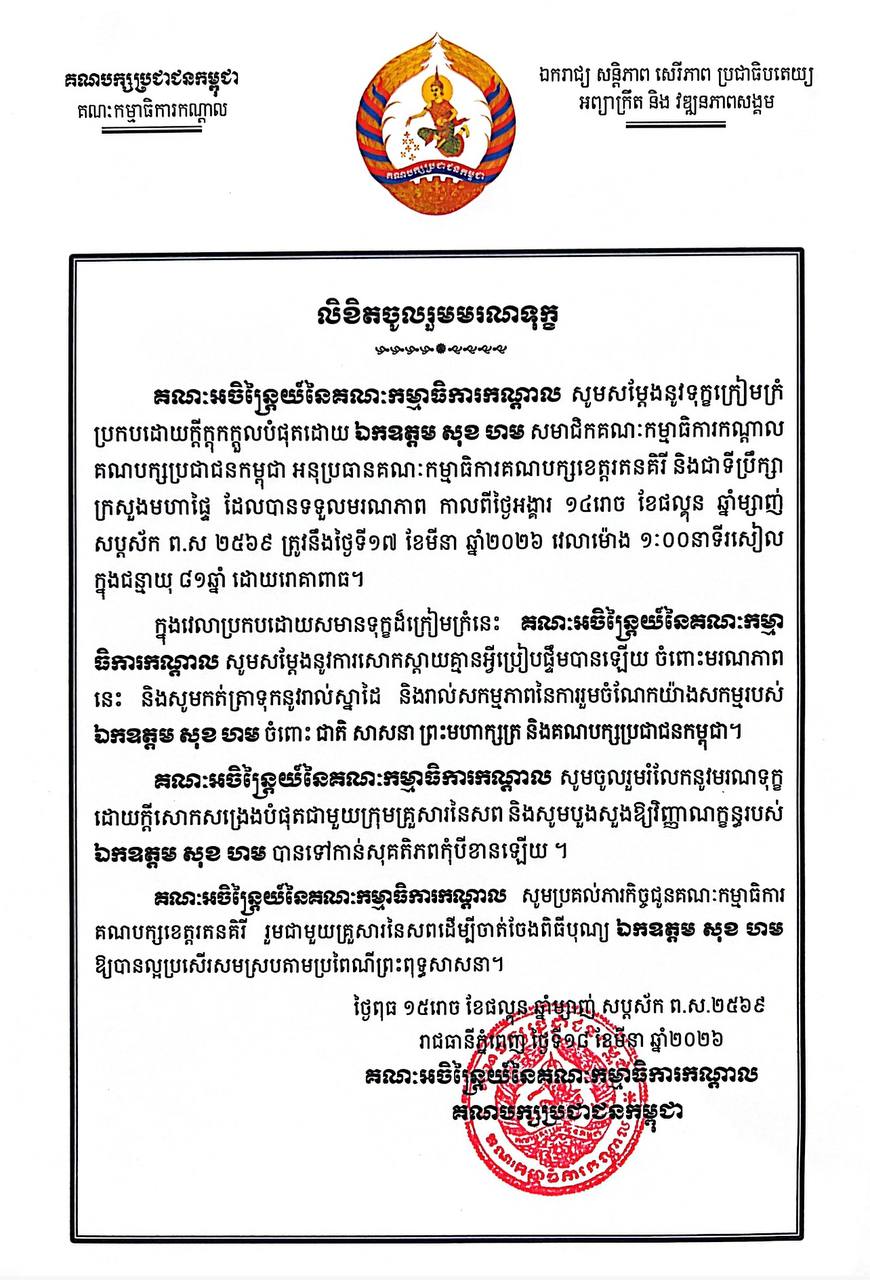 (ភ្នំពេញ)៖ គណៈអចិន្ត្រៃយ៍ នៃគណៈកម្មាធិការកណ្ដាល គណបក្សប្រជាជនកម្ពុជា បានសម្តែងនូវទុក្ខក្រៀមក្រំប្រកបដោយក្តីក្តុកក្ដួលបំផុតដោយលោក សុខ ហម សមាជិកគណៈកម្មាធិការកណ្តាល គណបក្សប្រជាជនកម្ពុជា អនុប្រធានគណៈកម្មាធិការគណបក្សខេត្តរតនគិរី និងជាទីប្រឹក្សាក្រសួងមហាផ្ទៃ ដែលបានទទួលមរណភាព កាលពីថ្ងៃអង្គារ ១៤រោច ខែផល្គុន ឆ្នាំម្សាញ់ សប្ដស័ក ព.ស ២៥៦៩ ត្រូវនឹងថ្ងៃទី១៧ ខែមីនា ឆ្នាំ២០២៦ វេលាម៉ោង១៖០០នាទីរសៀល ក្នុងជន្មាយុ ៨១ឆ្នាំ ដោយរោគាពាធ។