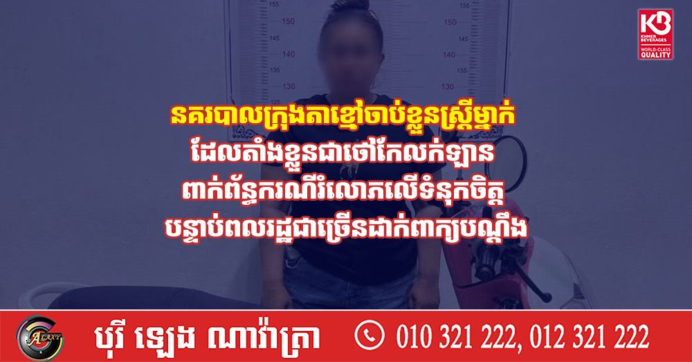 (កណ្ដាល)៖ ក្រោយទទួលបានពាក្យបណ្ដឹងពីពលរដ្ឋជាច្រើននាក់ ករណីចាញ់បោកស្ត្រីម្នាក់ ដែលដើរបោកគេពេញក្រុងតាខ្មៅរួចមក នគរបាលក្រុងតាខ្មៅ បានធ្វើការចាប់ខ្លួនស្ត្រីម្នាក់ ពាក់ព័ន្ធករណីរំលោភលើទំនុកចិត្ត។