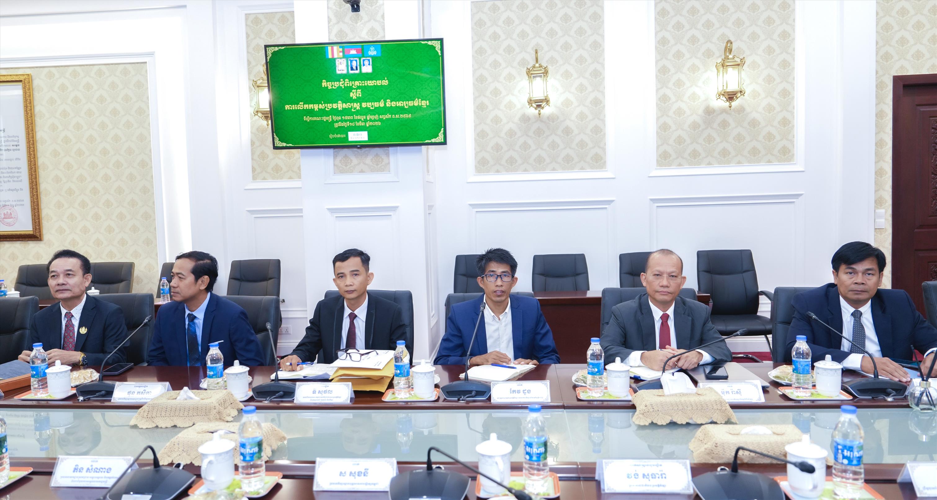 (ភ្នំពេញ)៖ នាថ្ងៃទី១៨ ខែមីនា ឆ្នាំ២០២៦ លោក វង្សី វិស្សុត ឧបនាយករដ្ឋមន្ត្រីប្រចាំការ រដ្ឋមន្រ្តី ទទួលបន្ទុកទីស្តីការគណៈរដ្ឋមន្ត្រី បានដឹកនាំកិច្ចប្រជុំពិគ្រោះយោបល់ស្តីពីការលើកកម្ពស់ប្រវត្តិសាស្រ្ត វប្បធម៌ និងអារ្យធម៌ខ្មែរ ដែលរៀបចំដោយក្រុមប្រឹក្សាសេដ្ឋកិច្ច សង្គមកិច្ច និងវប្បធម៌ នៃទីស្តីការគណៈរដ្ឋមន្រ្តី។ កិច្ចប្រជុំនេះ មានការអញ្ជើញចូលរួមពី សំណាក់ប្រវត្តិវិទូ, អ្នកនរវិទ្យា, ពន្ធុវិទ្យា, វប្បធម៌ និងអ្នកជំនាញសិលាចារឹក។