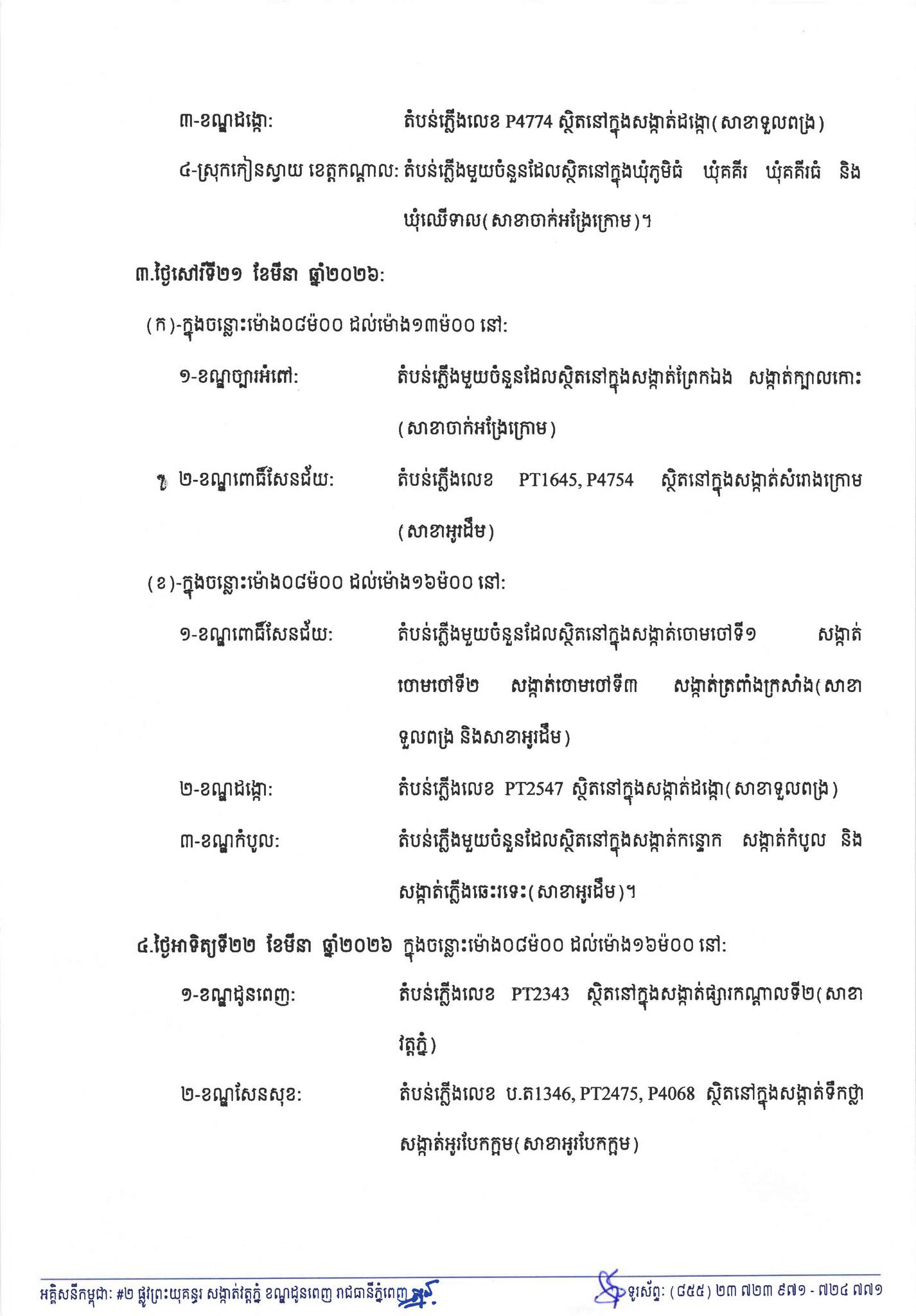 (ភ្នំពេញ)៖ អគ្គិសនីកម្ពុជា (EDC) បានចេញសេចក្តីជូនដំណឹង ស្តីពីការអនុវត្តការងារជួសជុល ផ្លាស់ប្តូរដំឡើងបរិក្ខារនានា និងរុះរើគន្លងខ្សែបណ្តាញ អគ្គិសនីរបស់អគ្គិសនីកម្ពុជា ដើម្បីបង្កលក្ខណៈងាយស្រួលដល់ការដ្ឋានពង្រីកផ្លូវ នៅថ្ងៃទី១៩ ខែមីនា ឆ្នាំ២០២៦ ដល់ថ្ងៃទី២២ ខែមីនា ឆ្នាំ២០២៦ នៅតំបន់មួយចំនួនទៅតាមពេលវេលា និងទីកន្លែងដូចសេចក្តីជូនដំណឹងលម្អិតខាងក្រោម។