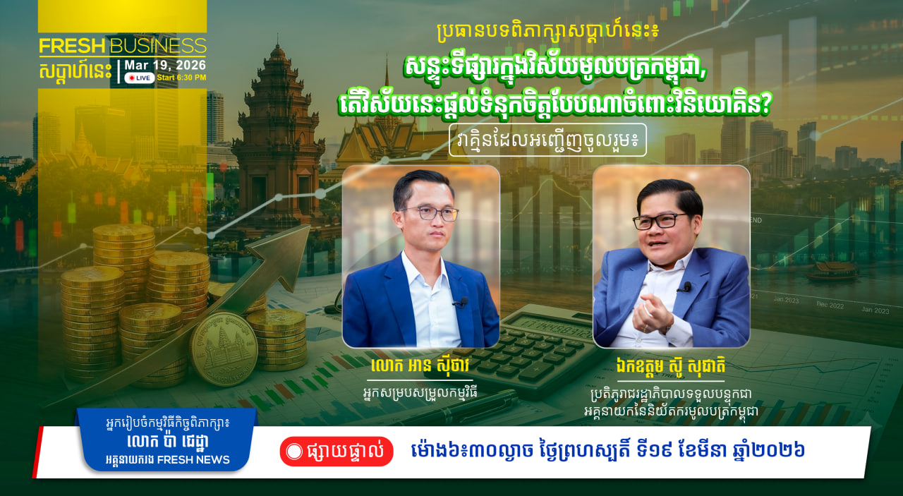 FRESH BUSINESS: កិច្ចពិភាក្សាស្តីពី «សន្ទុះទីផ្សារក្នុងវិស័យមូលបត្រកម្ពុជា, តើវិស័យនេះផ្តល់ទំនុកចិត្តកម្រិតណាចំពោះវិនិយោគិន?» សូមរង់ចាំទស្សនា នៅល្ងាចថ្ងៃព្រហស្បតិ៍នេះ