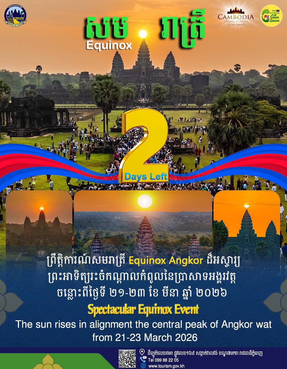 (ភ្នំពេញ)៖ នៅសល់រយៈពេល២ថ្ងៃទៀតប៉ុណ្ណោះ ព្រឹត្តិការណ៍ដ៏អស្ចារ្យនៃសមរាត្រីអង្គរ (Equinox) នឹងកើតឡើងចាប់ពីថ្ងៃទី២១ ដល់ថ្ងៃទី២៣ ខែមីនា ឆ្នាំ២០២៦ នៅលើទឹកដីអង្គរ ខេត្តសៀមរាប។ នេះបើយោងតាមការបញ្ជាក់របស់ក្រសួងទេសចរណ៍ នៅថ្ងៃទី១៩ ខែមីនា ឆ្នាំ២០២៦។