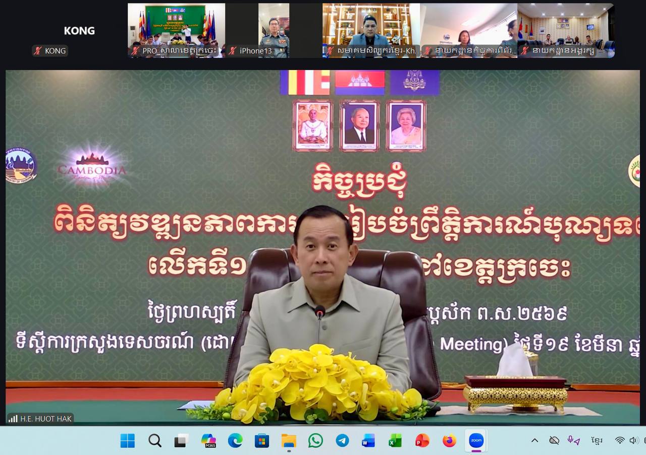 (ភ្នំពេញ)៖ លោក ហួត ហាក់ រដ្ឋមន្ត្រីក្រសួងទេសចរណ៍ និងជាប្រធានគណៈកម្មការអន្តរក្រសួង នៅថ្ងៃទី១៩ ខែមីនា ឆ្នាំ២០២៦ បានអញ្ជើញជាដឹកនាំកិច្ចប្រជុំគណៈកម្មការអន្តរក្រសួង ដើម្បីត្រួតពិនិត្យវឌ្ឍនភាពការងារត្រៀមរៀបចំព្រឹត្តិការណ៍បុណ្យទន្លេលើកទី១០ ឆ្នាំ២០២៦ ដែលសម្តេចមហាបវរធិបតីហ៊ុន ម៉ាណែត នាយករដ្ឋមន្ត្រីនៃកម្ពុជា បានអនុញ្ញាតជាគោលការណ៍ដ៏ខ្ពង់ខ្ពស់ឱ្យរៀបចំព្រឹត្តិការណ៍បុណ្យទន្លេលើកទី១០ នៅខេត្តក្រចេះ ចាប់ពីថ្ងៃទី២៧ ដល់ថ្ងៃទី២៩ ខែមីនា ឆ្នាំ២០២៦ ក្រោមប្រធានបទ «ទន្លេបៃតង បេតិកភណ្ឌវប្បធម៌ និងធម្មជាតិមហាសាល»។