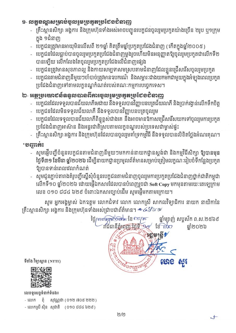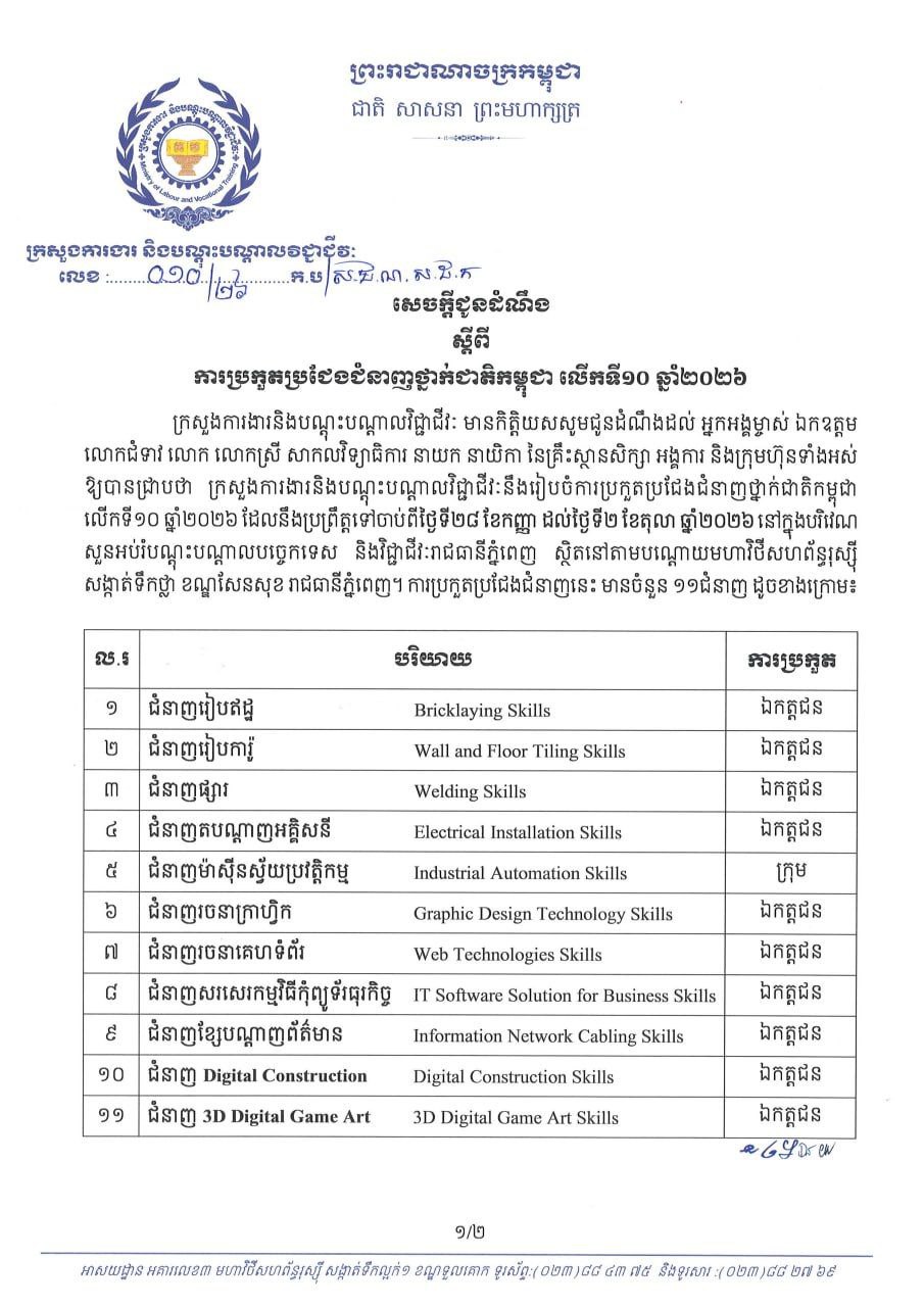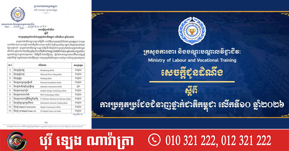 ក្រសួងការងារ ចេញសេចក្តីជូនដំណឹងស្តីពី ការប្រកួតប្រជែងជំនាញថ្នាក់ជាតិកម្ពុជា លើកទី១០ ឆ្នាំ២០២៦