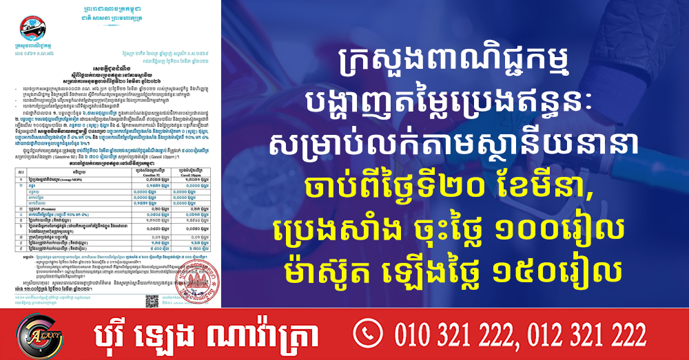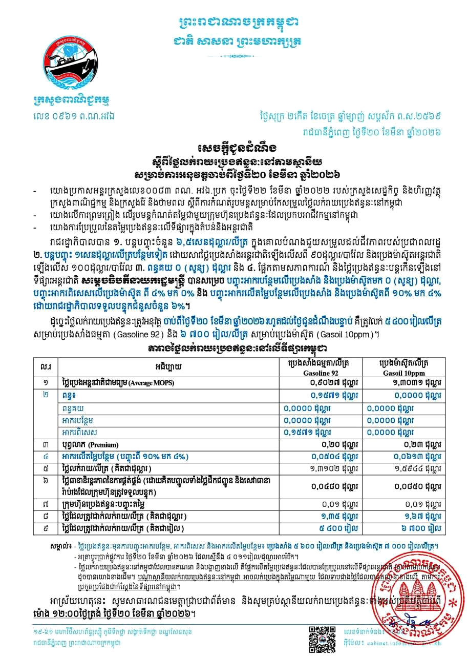 (ភ្នំពេញ)៖ នៅថ្ងៃទី២០ ខែមីនា ឆ្នាំ២០២៦នេះ ក្រសួងពាណិជ្ជកម្ម បានបញ្ចេញអត្រាតម្លៃប្រេងឥន្ធនៈថ្មី សម្រាប់លក់រាយតាមស្ថានីយនានាចាប់ពីថ្ងៃទី២០ ខែមីនា ឆ្នាំ២០២៦តទៅ។