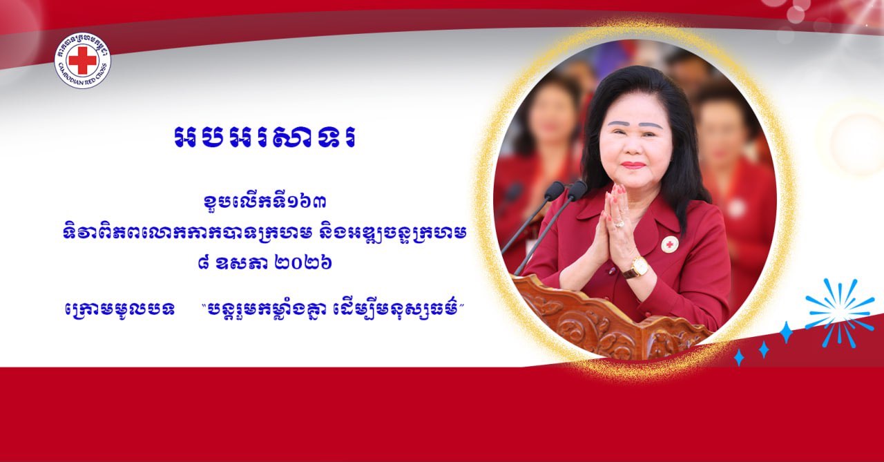 សម្តេចកិត្តិព្រឹទ្ធបណ្ឌិត ប៊ុន រ៉ានី ហ៊ុនសែន ប្រធានកាកបាទ ក្រហមកម្ពុជា សូមថ្លែងអំណរគុណយ៉ាងជ្រាលជ្រៅបំផុតចំពោះ អគ្គលេខាធិការដ្ឋានរដ្ឋសភា ឧបត្ថម្ភថវិកាចំនួន ៥,០០០,០០០លានរៀល ជូនកាកបាទក្រហមកម្ពុជា ក្នុងឱកាសខួបលើកទី១៦៣ ទិវាពិភពលោក កាកបាទក្រហម និងអឌ្ឍចន្ទក្រហម ៨ ឧសភា ឆ្នាំ២០២៦ ក្រោមមូលបទ «បន្តរួមកម្លាំងគ្នា ដើម្បីមនុស្សធម៌»។