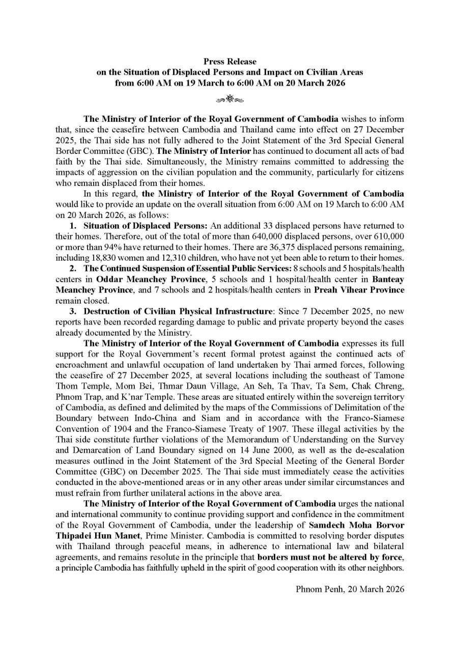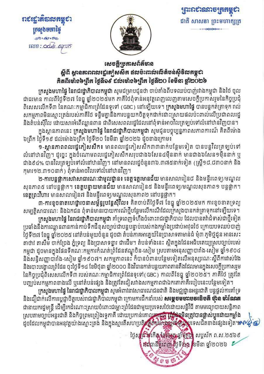 (ភ្នំពេញ)៖ ក្រសួងមហាផ្ទៃ នៅថ្ងៃទី២០ ខែមីនា ឆ្នាំ២០២៦នេះ បានឲ្យដឹងថា គិតចាប់ពីម៉ោង ៦ព្រឹក ថ្ងៃទី១៩ ដល់ម៉ោង៦ព្រឹក ថ្ងៃទី២០ ខែមីនា ឆ្នាំ២០២៦នេះ មានប្រជាពលរដ្ឋភៀសសឹក ៣៣នាក់បន្ថែមទៀត បានវិលត្រឡប់ទៅលំនៅឋានវិញ។ ដូច្នេះក្នុងចំណោមពលរដ្ឋភៀសសឹកសរុបជាង៦សែន ៤ម៉ឺននាក់ មានជាង ៦សែន ១ម៉ឺននាក់ ស្មើ ៩៤ភាគរយ បានវិលត្រឡប់ទៅលំនៅឋានវិញ។
