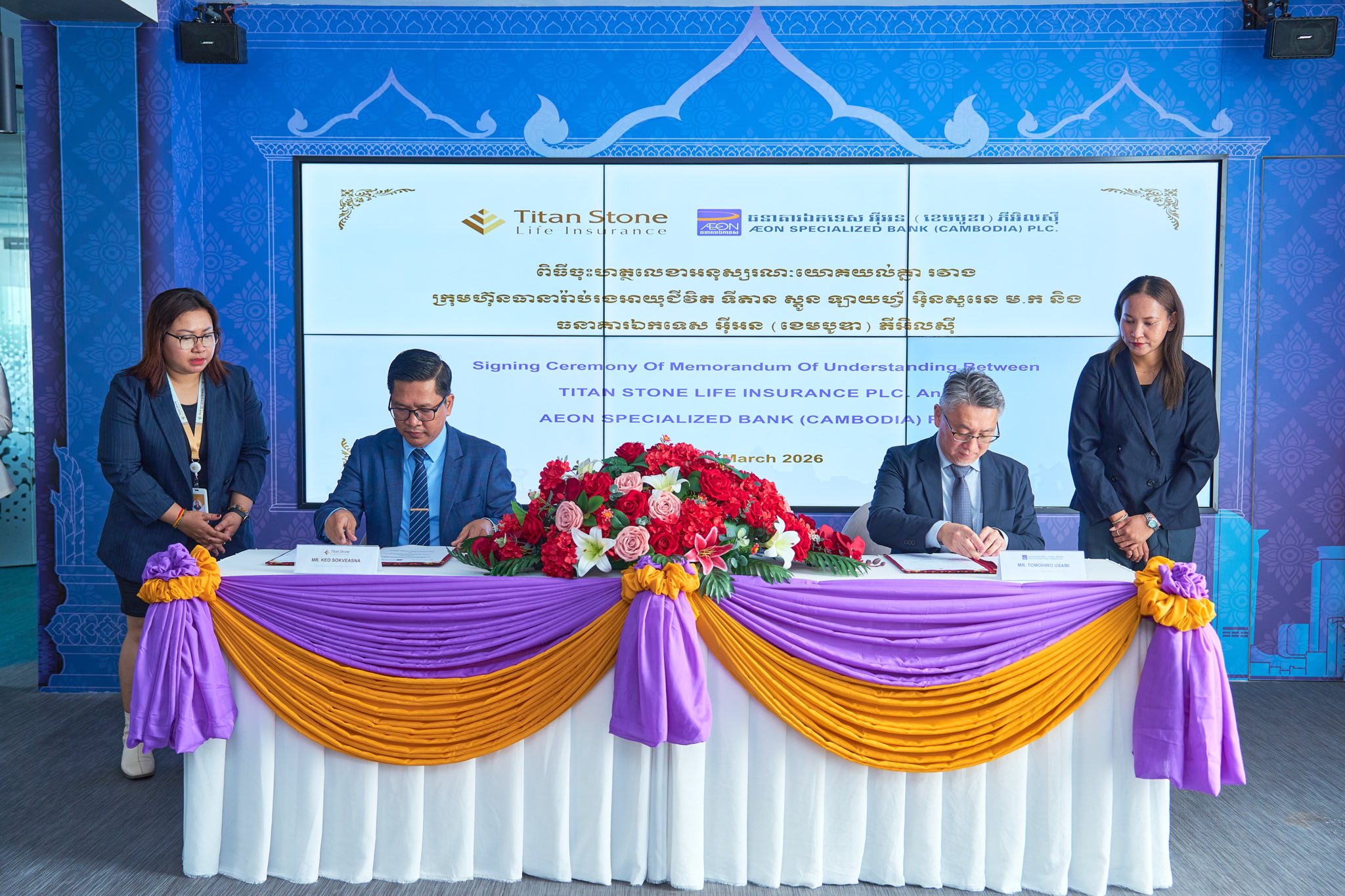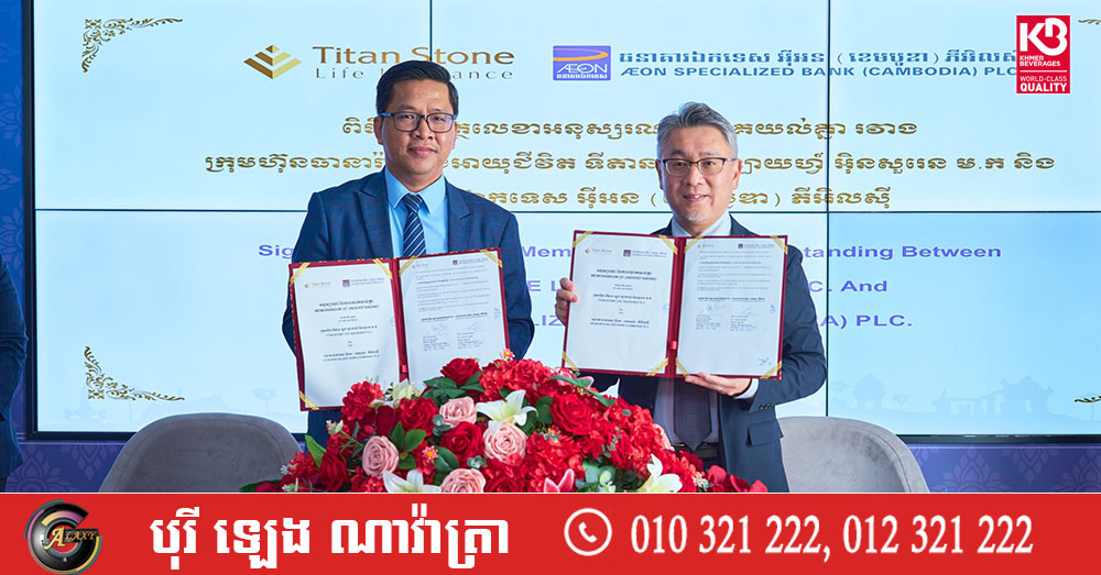 (ភ្នំពេញ)៖ ក្រុមហ៊ុនធានារ៉ាប់រងអាយុជីវិត ទីតាន ស្តូន ឡាយហ្វ៍ អ៊ិនសួរេន ម.ក និង ធនាគារឯកទេស អ៊ីអន (ខេមបូឌា) ភីអិលស៊ី នៅថ្ងៃទី២០ ខែមីនា ឆ្នាំ២០២៦នេះ បានចុះហត្ថលេខាជាផ្លូវការ លើអនុស្សរណៈយោគយល់ (MOU) ដើម្បីផ្តល់អត្ថប្រយោជន៍ជូនអតិថិជនអ៊ីអនវីសាកាត ក្នុងការជាវបណ្ណសន្យារ៉ាប់រង ពីក្រុមហ៊ុនធានារ៉ាប់រងអាយុជីវិត ទីតាន ស្តូន ដោយប្រើប្រាស់វីសាកាតរបស់ធនាគារឯកទេស អ៊ីអន។