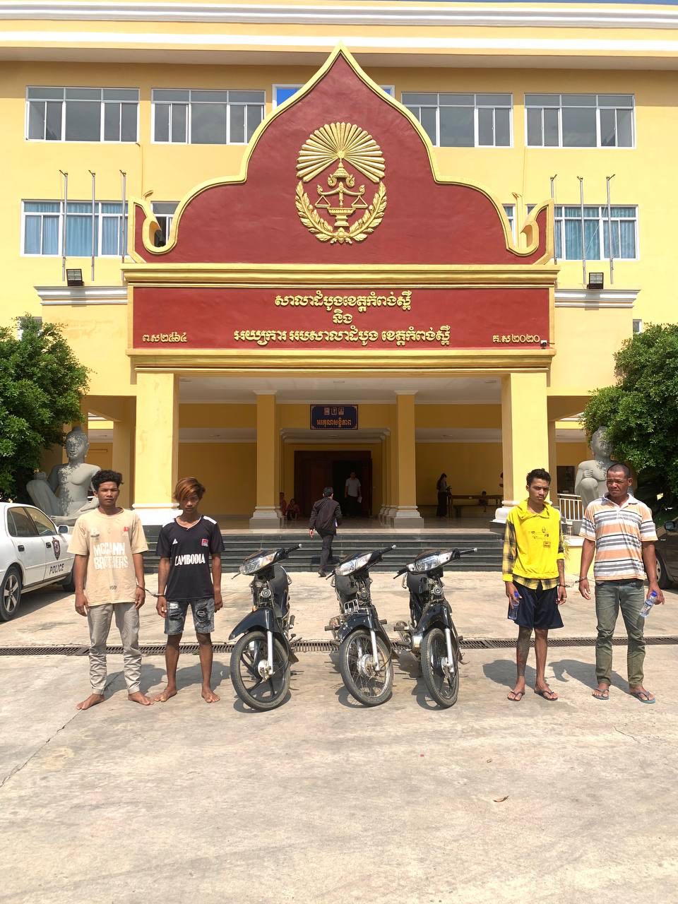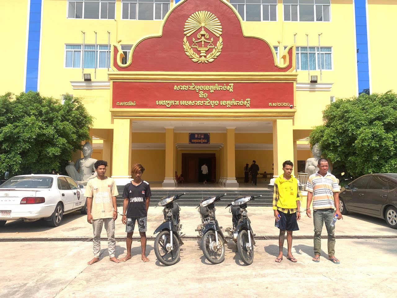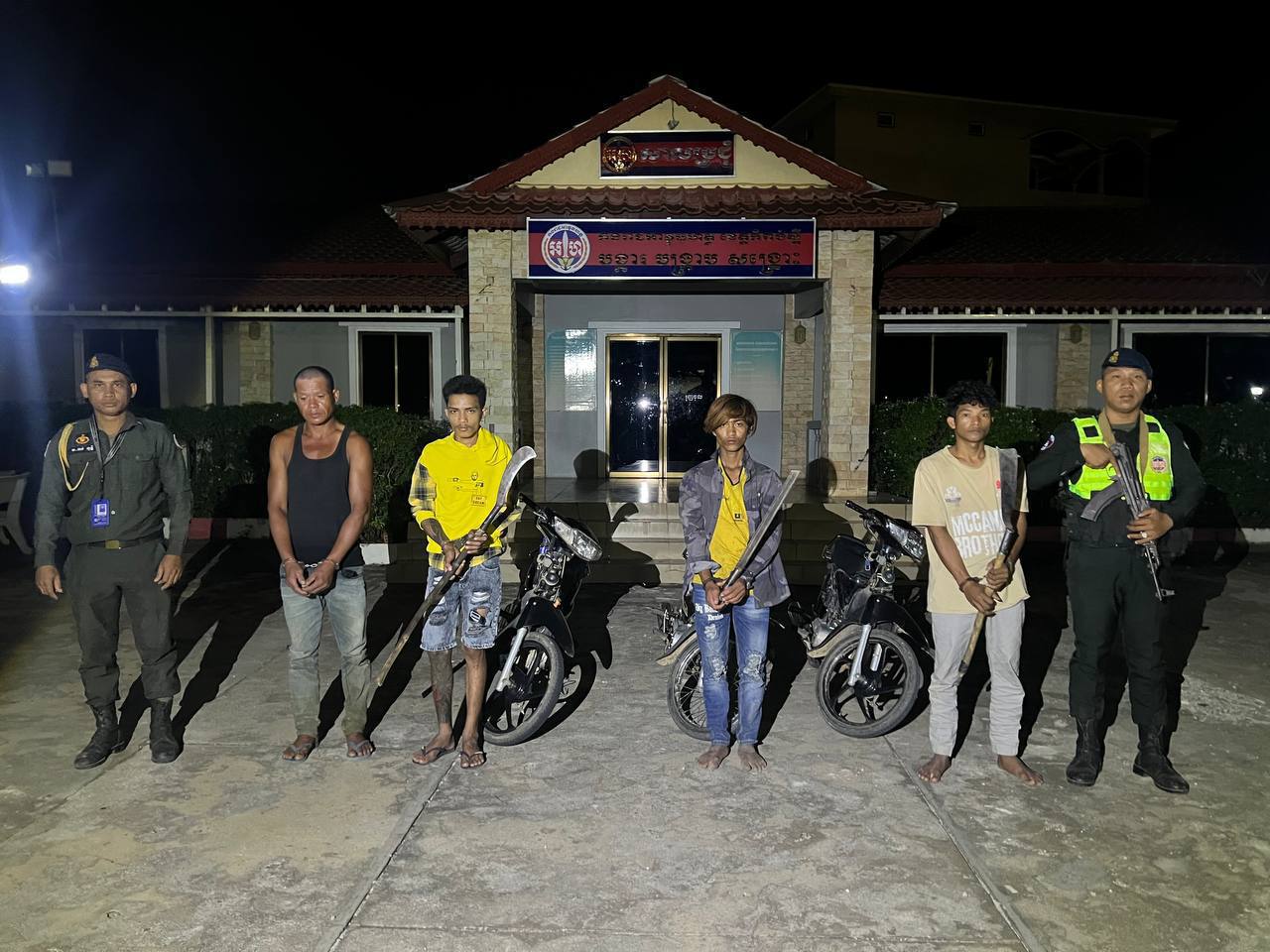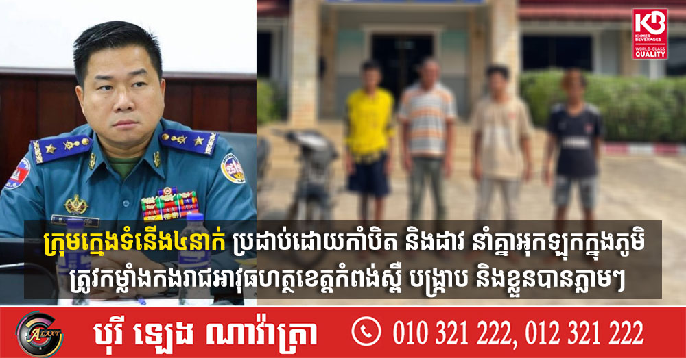 (កំពង់ស្ពឺ)៖ ដោយអនុវត្តតាមបទបញ្ជាយ៉ាងម៉ឺងម៉ាត់របស់ លោកឧត្តមសេនីយ៍ត្រី ម៉េង ស្រ៊ុន មេបញ្ជាការកងរាជអាវុធហត្ថខេត្តកំពង់ស្ពឺ និងមានការសម្របសម្រួលនីតិវិធីដោយព្រះរាជអាជ្ញាអមសាលាដំបូងខេត្ត កម្លាំងអាវុធហត្ថ បានចេញប្រតិបត្តិការដោយបង្ក្រាបក្រុមក្មេងទំនើង៤នាក់ ប្រដាប់ដោយកាំបិត និងដាវ នាំគ្នាអុកឡុកក្នុងភូមិ ដែលធ្វើឲ្យបង្កការភ័យខ្លាចដល់ប្រជាពលរដ្ឋ និងប៉ះពាល់ដល់សន្តិសុខតាមមូលដ្ឋាន។
