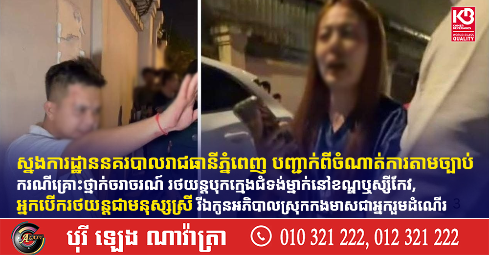 ស្នងការដ្ឋាននគរបាលរាជធានីភ្នំពេញ បញ្ជាក់ពីចំណាត់ការតាមច្បាប់ ករណីគ្រោះថ្នាក់ចរាចរណ៍រថយន្តបុកក្មេងជំទង់ម្នាក់នៅខណ្ឌឬស្សីកែវ, អ្នកបើករថយន្តជាមនុស្សស្រី រីឯកូនអភិបាលស្រុកកងមាសជាអ្នករួមដំណើរ