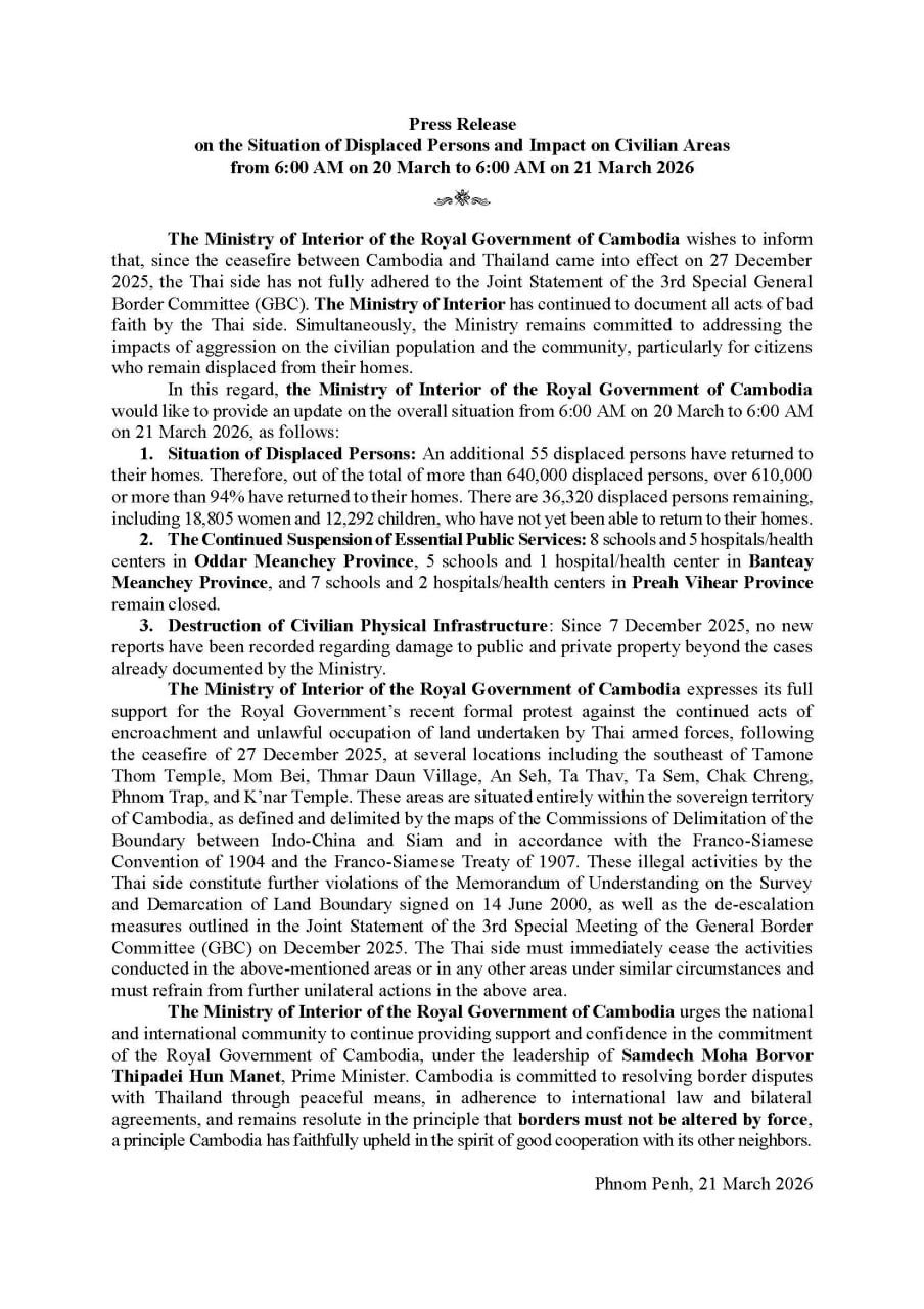 (ភ្នំពេញ)៖ ក្រសួងមហាផ្ទៃ នៅព្រឹកថ្ងៃទី២១ ខែមីនា ឆ្នាំ២០២៦នេះ បានឲ្យដឹងថា គិតចាប់ពីម៉ោង៦ព្រឹក ថ្ងៃទី២០ ដល់ម៉ោង៦ព្រឹក ថ្ងៃទី២១ ខែមីនា ឆ្នាំ២០២៦នេះ មានប្រជាពលរដ្ឋភៀសសឹក ៥៥នាក់ បានវិលត្រឡប់ទៅលំនៅឋានវិញ។ ដូច្នេះក្នុងចំណោមពលរដ្ឋភៀសសឹកសរុបជាង ៦សែន៤ម៉ឺននាក់ មានជាង៦សែន១ម៉ឺននាក់ ស្មើប្រមាណជាង៩៤ភាគរយ បានវិលត្រឡប់ទៅលំនៅឋានវិញ។