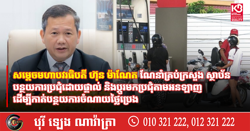 (ភ្នំពេញ)៖ សម្ដេចមហាបវរធិបតី ហ៊ុន ម៉ាណែត នាយករដ្ឋមន្ដ្រីនៃកម្ពុជា បានណែនាំដល់គ្រប់បណ្ដាក្រសួង ស្ថាប័នទាំងអស់ ត្រូវកាត់បន្ថយការប្រជុំដោយផ្ទាល់ និងត្រូវប្ដូរមកប្រជុំតាមប្រព័ន្ធអនឡាញ ដើម្បីកាត់បន្ថយការចំណាយថ្លៃប្រេង និងកាត់បន្ថយការប្រើប្រាស់ប្រេងឥន្ធនៈចំពោះមធ្យោបាយធ្វើដំណើរ លើកលែងករណីចាំបាច់។