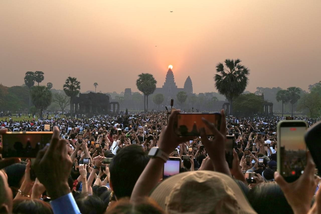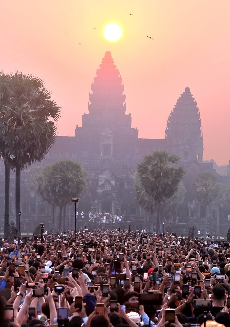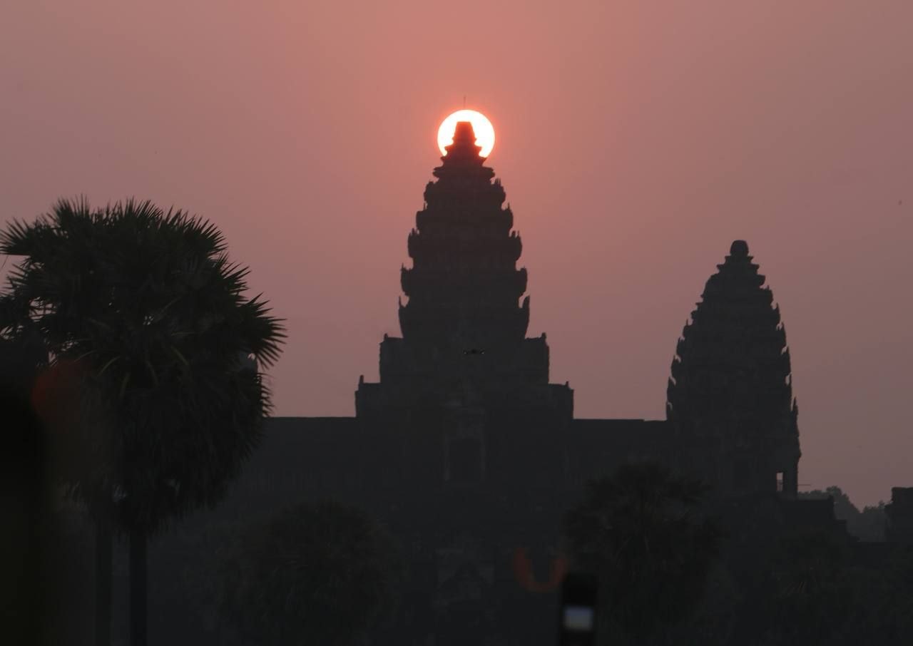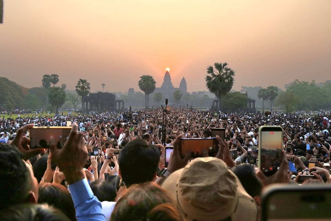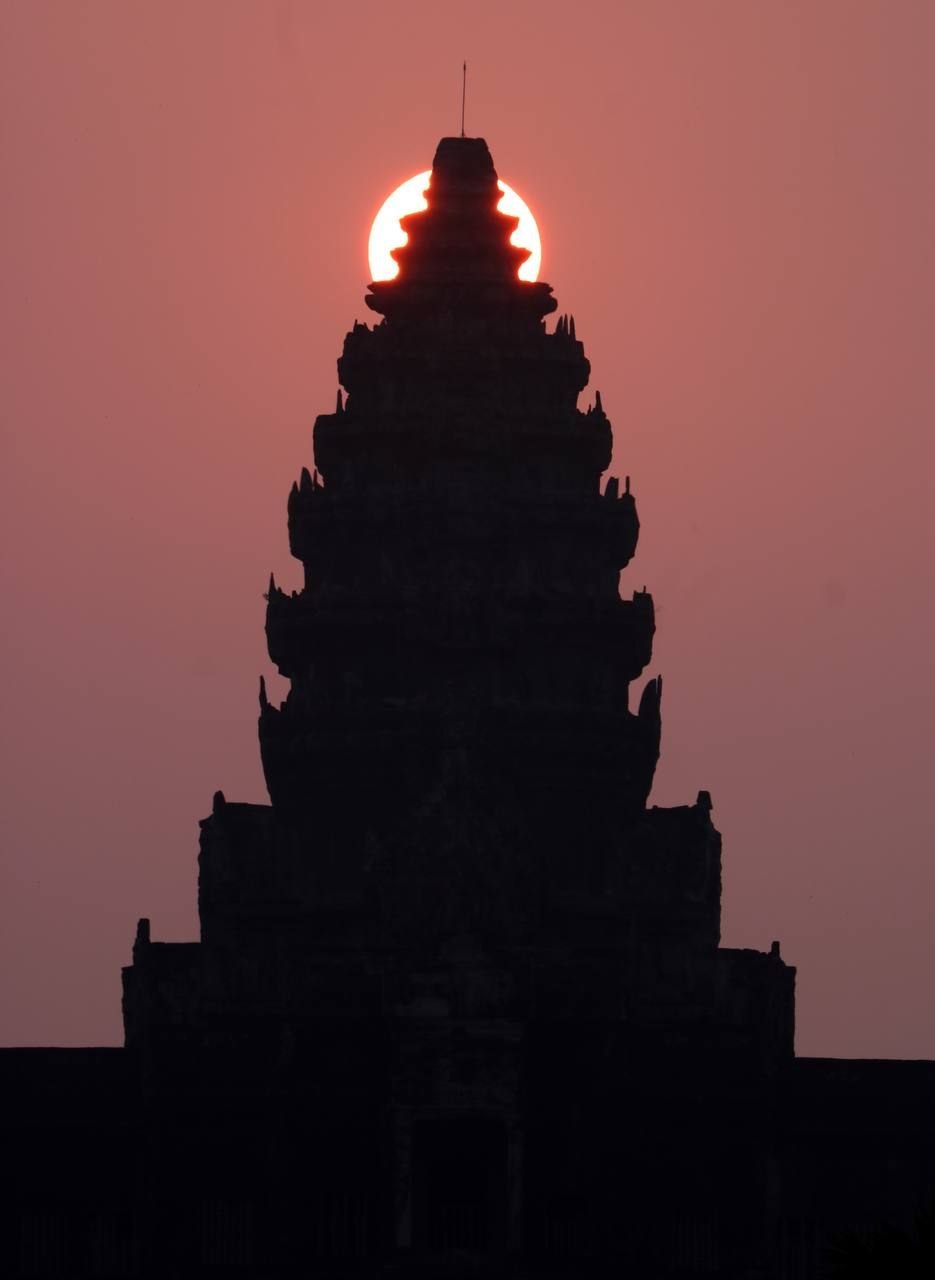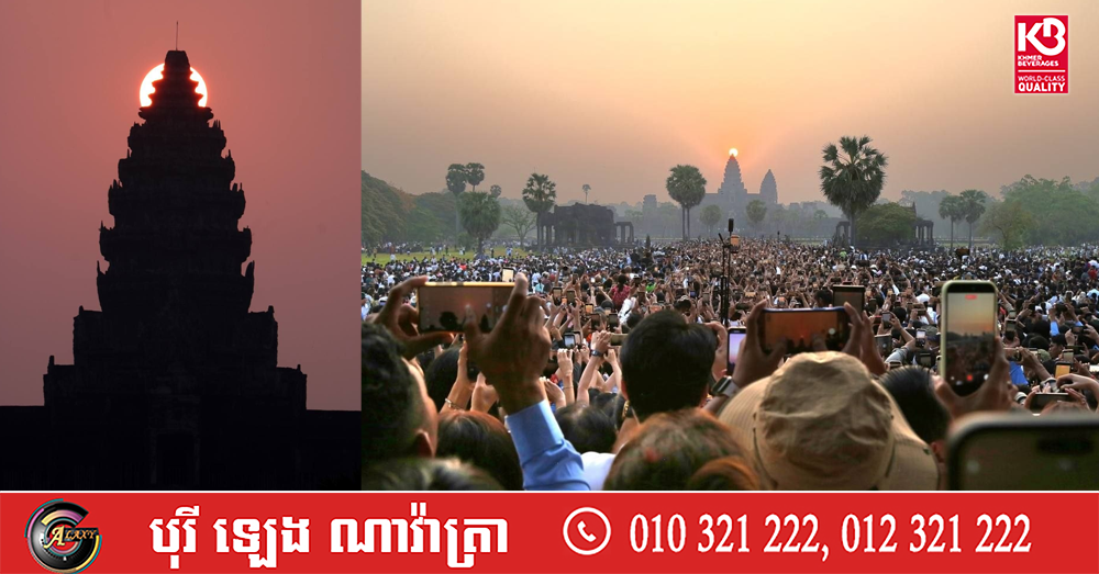 សូមទស្សនាទិដ្ឋភាពដ៏អស្ចារ្យ និងកម្រនៃព្រឹត្តិការណ៍ «សមរាត្រី» (Vernal Equinox) ដែលព្រះអាទិត្យរះឡើងចំកំពូលកណ្ដាលនៃប្រាសាទអង្គរវត្ត៖