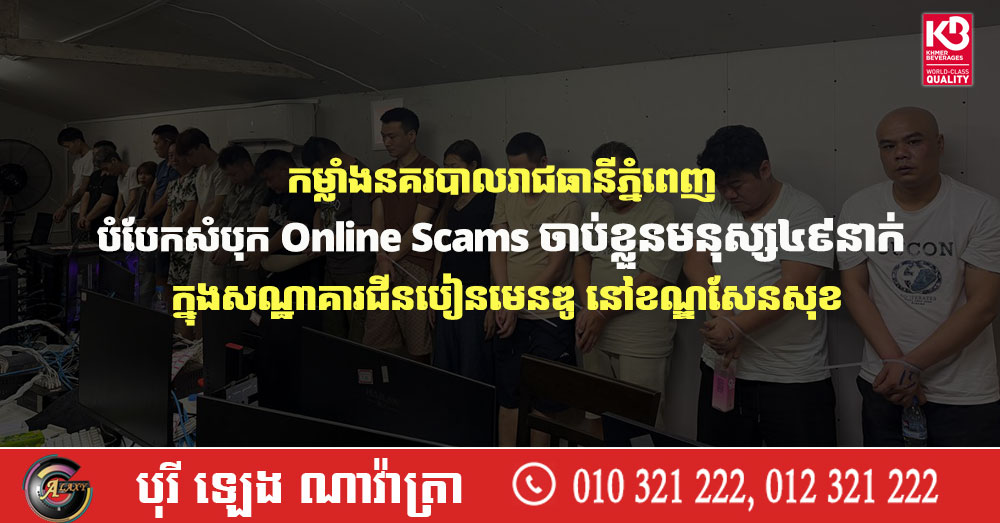 កម្លាំងនគរបាលរាជធានីភ្នំពេញ បំបែកសំបុក Online Scams ចាប់ខ្លួនមនុស្ស៤៩នាក់ ក្នុងសណ្ឋាគារជីនបៀនមេនឌូ នៅខណ្ឌសែនសុខ