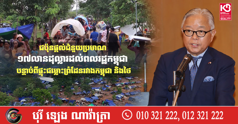 (ភ្នំពេញ)៖ ចាប់តាំងពីប្រទេសកម្ពុជា និងប្រទេសថៃ បានផ្ទុះជម្លោះនៅពាក់កណ្ដាលឆ្នាំ២០២៥ រដ្ឋាភិបាលជប៉ុន បានផ្ដល់ជំនួយសង្គ្រោះបន្ទាន់យ៉ាងហោចណាស់ប្រមាណ ១៧លានដុល្លារសហរដ្ឋអាម៉េរិក ដើម្បីជួយដល់ប្រជាពលរដ្ឋខ្មែរភៀសសឹក ពីជម្លោះប្រដាប់អាវុធ និងជួយដល់ពលករខ្មែរដែលវិលត្រឡប់ពីប្រទេសថៃ ចូលមកមាតុភូមិកំណើតវិញ និងលើវិស័យនានាដូចជា វិធានការប្រឆាំងគ្រាប់មីន និងយុទ្ធភណ្ឌមិនទាន់ផ្ទុះជាដើម។