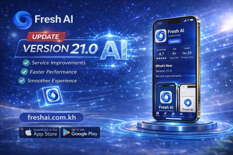 (ភ្នំពេញ)៖ ការវិវត្តចុងក្រោយបង្អស់របស់ Fresh AI បានបន្តធ្វើបច្ចុប្បន្នភាព Version 21 គឺជាសក្ខីភាពនៃការបង្កើនប្រសិទ្ធភាពប្រើប្រាស់ឱ្យកាន់តែសាមញ្ញ និងមានថាមពលខ្លាំងជាងមុន។ Fresh AI បានធ្វើការប្រមូលផ្តុំ និងរៀបចំរចនាសម្ព័ន្ធមុខងារយ៉ាងច្រើនឱ្យមកស្ថិតនៅក្រោមដំបូលតែមួយ ដែលអនុញ្ញាតឱ្យអ្នកប្រើប្រាស់អាចទាញយកអត្ថប្រយោជន៍ពីបច្ចេកវិទ្យា AI គ្រប់ជ្រុងជ្រោយដោយមិនចាំបាច់ឆ្លងកាត់ដំណាក់កាលស្មុគស្មាញឡើយ។