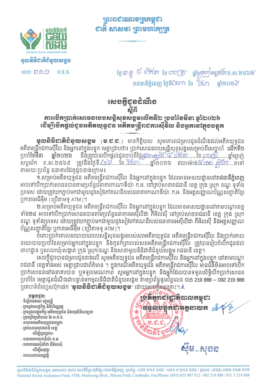 មូលនិធិជាតិជំនួយសង្គម៖ ការបើកប្រាក់សោធនរបបសន្តិសុខសង្គម លើកទី២ ប្រចាំខែមីនា ឆ្នាំ២០២៦ ជូនអតីតយុទ្ធជន អតីតមន្ត្រីរាជការស៊ីវិល និងអ្នកនៅក្នុងបន្ទុក ចាប់ពីម៉ោង០៩ព្រឹក ថ្ងៃទី២៦ ខែមីនា