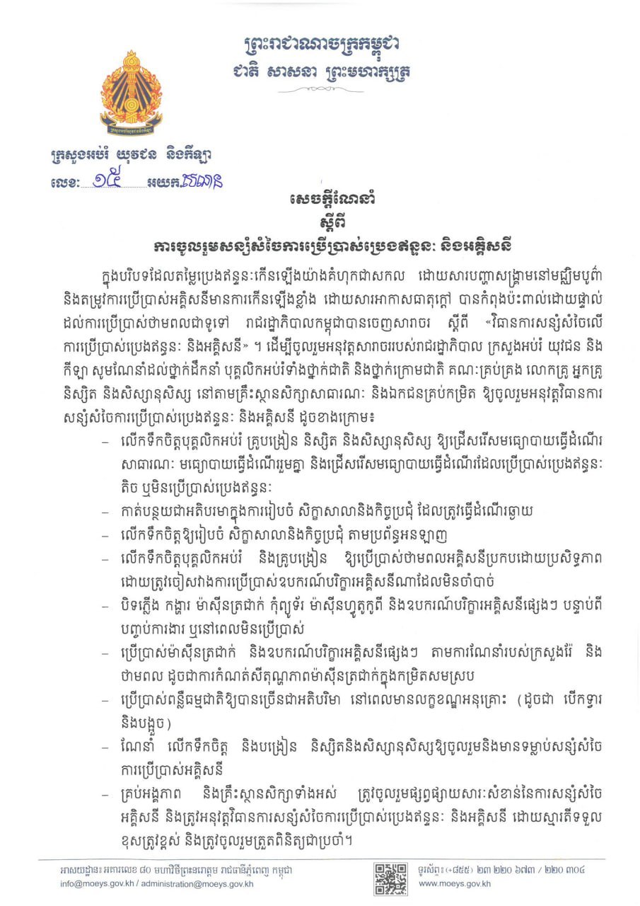 ក្រសួងអប់រំ បានឲ្យដឹងថា ក្នុងបរិបទដែលតម្លៃប្រេងឥន្ធនៈកើនឡើង យ៉ាងគំហុកជាសកល ដោយសារបញ្ហាសង្គ្រាមនៅមជ្ឈិមបូព៌ា និងតម្រូវការប្រើប្រាស់អគ្គិសនី មានការកើនឡើងខ្លាំង ដោយសារអាកាសធាតុក្តៅ បានកំពុងប៉ះពាល់ដោយផ្ទាល់ ដល់ការប្រើប្រាស់ថាមពលជាទូទៅ រាជរដ្ឋាភិបាលកម្ពុជាបានចេញសារាចរ ស្តីពី «វិធានការសន្សំសំចៃលើ ការប្រើប្រាស់ប្រេងឥន្ធនៈ និងអគ្គិសនី»។