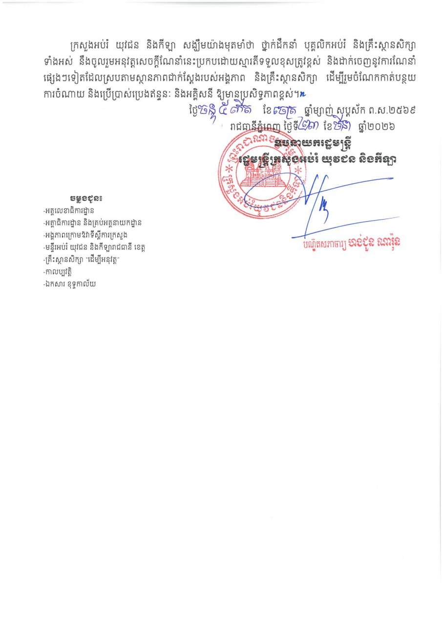 (ភ្នំពេញ)៖ ក្រសួងអប់រំ យុវជន និងកីឡា បានចេញសេចក្តីណែនាំ ស្តីពី ការចូលរួមសន្សំសំចៃការប្រើប្រាស់ប្រេងឥន្ទនៈ និងអគ្គិសនី និងលើកទឹកចិត្តឱ្យរៀបចំ សិក្ខាសាលា និងកិច្ចប្រជុំ តាមប្រព័ន្ធអនឡាញ ព្រមទាំងកាត់បន្ថយជាអតិបរមាក្នុងការរៀបចំ សិក្ខាសាលានិងកិច្ចប្រជុំ ដែលត្រូវធ្វើដំណើរឆ្ងាយ។