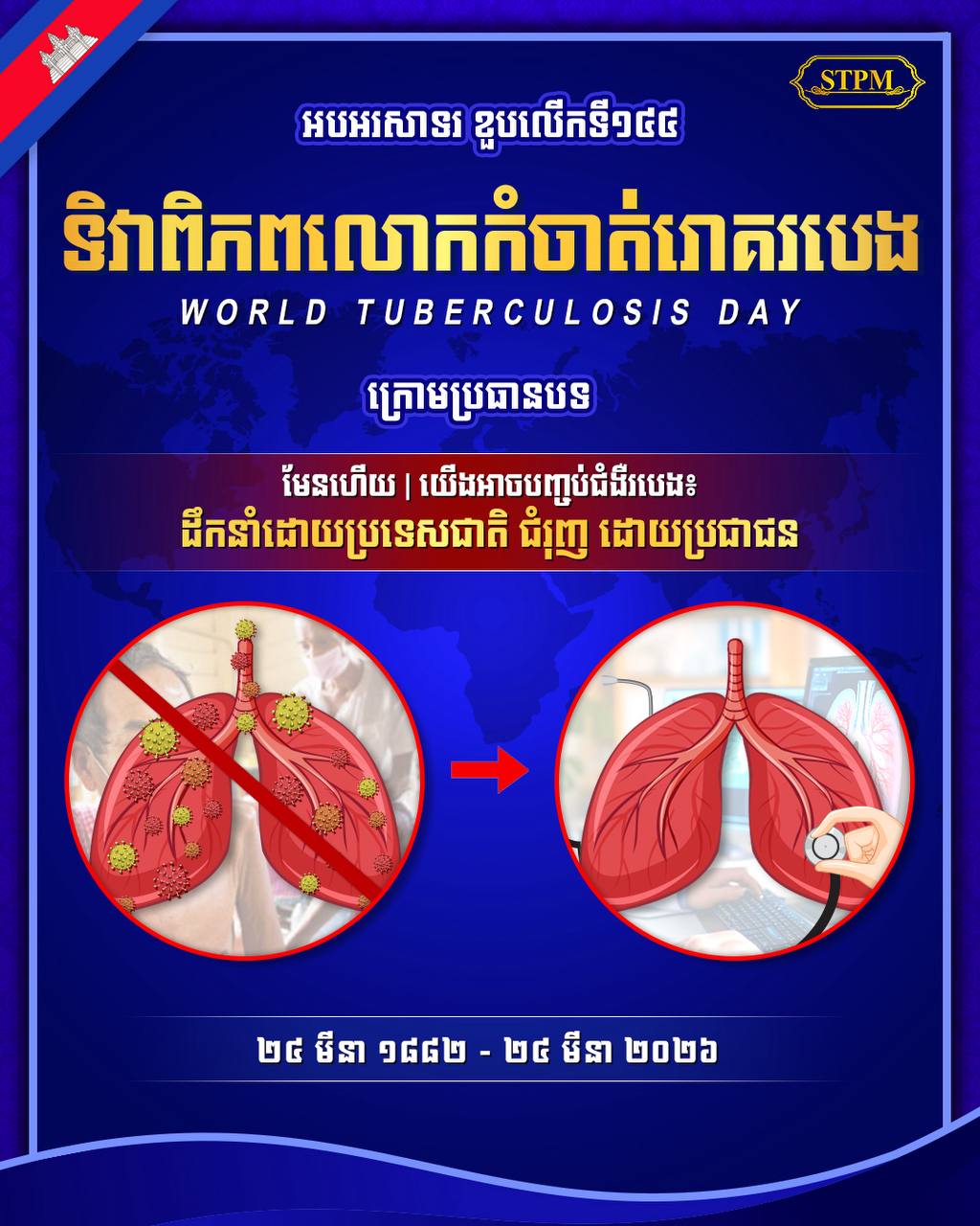(ភ្នំពេញ)៖ សម្តេចមហាបវរធិបតី ហ៊ុន ម៉ាណែត នាយករដ្ឋមន្ត្រីនៃកម្ពុជា នៅថ្ងៃទី២៤ ខែមីនា ឆ្នាំ២០២៦នេះ បានបង្ហោះសារអបអរសាទរ ខួបលើកទី១៤៤ ទិវាពិភពលោកកំចាត់រោគរបេង ក្រោមប្រធានបទ «មែនហើយ | យើងអាចបញ្ចប់ជំងឺរបេង៖ ដឹកនាំដោយប្រទេសជាតិ ជំរុញ ដោយប្រជាជន» (Yes! We can End TBI Led by countries. Powered by people.)។