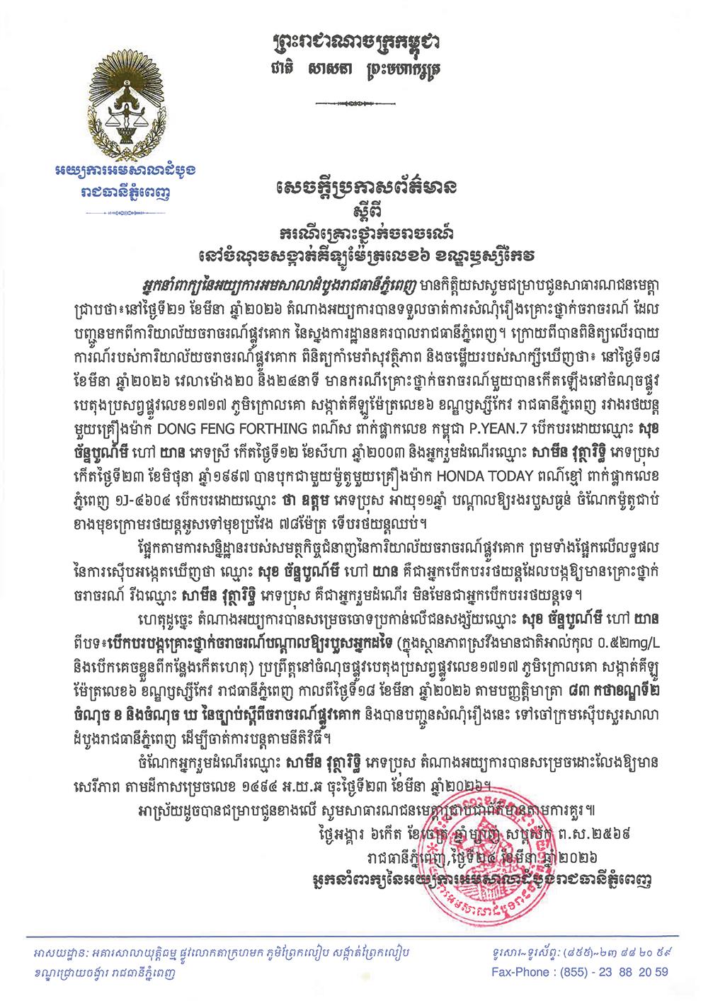 ស្នងការដ្ឋាននគរបាលរាជធានីភ្នំពេញ នៅថ្ងៃទី២១ ខែមីនា ឆ្នាំ២០២៦ បានបង្ហាញកាមេរ៉ាសុវត្ថិភាពដែលបញ្ជាក់ថា កូនអភិបាលស្រុកកងមាស ខេត្តកំពង់ចាម មិនមែនជាអ្នកបើករថយន្ដបង្កគ្រោះថ្នាក់ចរាចរណ៍នោះទេ ពោលអ្នកបើកបរគឺជាស្ដ្រីម្នាក់។ បើមើលតាមស្ថានភាពជាក់ស្ដែង គឺបុរសខាងលើមិនអាចបើករថយន្ដបានឡើយ ដោយសារតែស្ថានភាពស្រវឹងជោគជាំ។