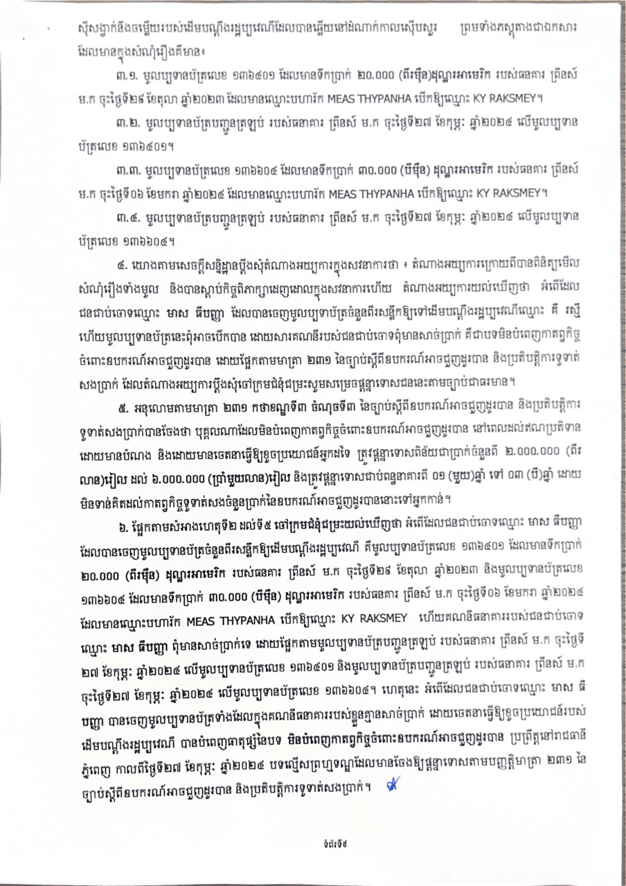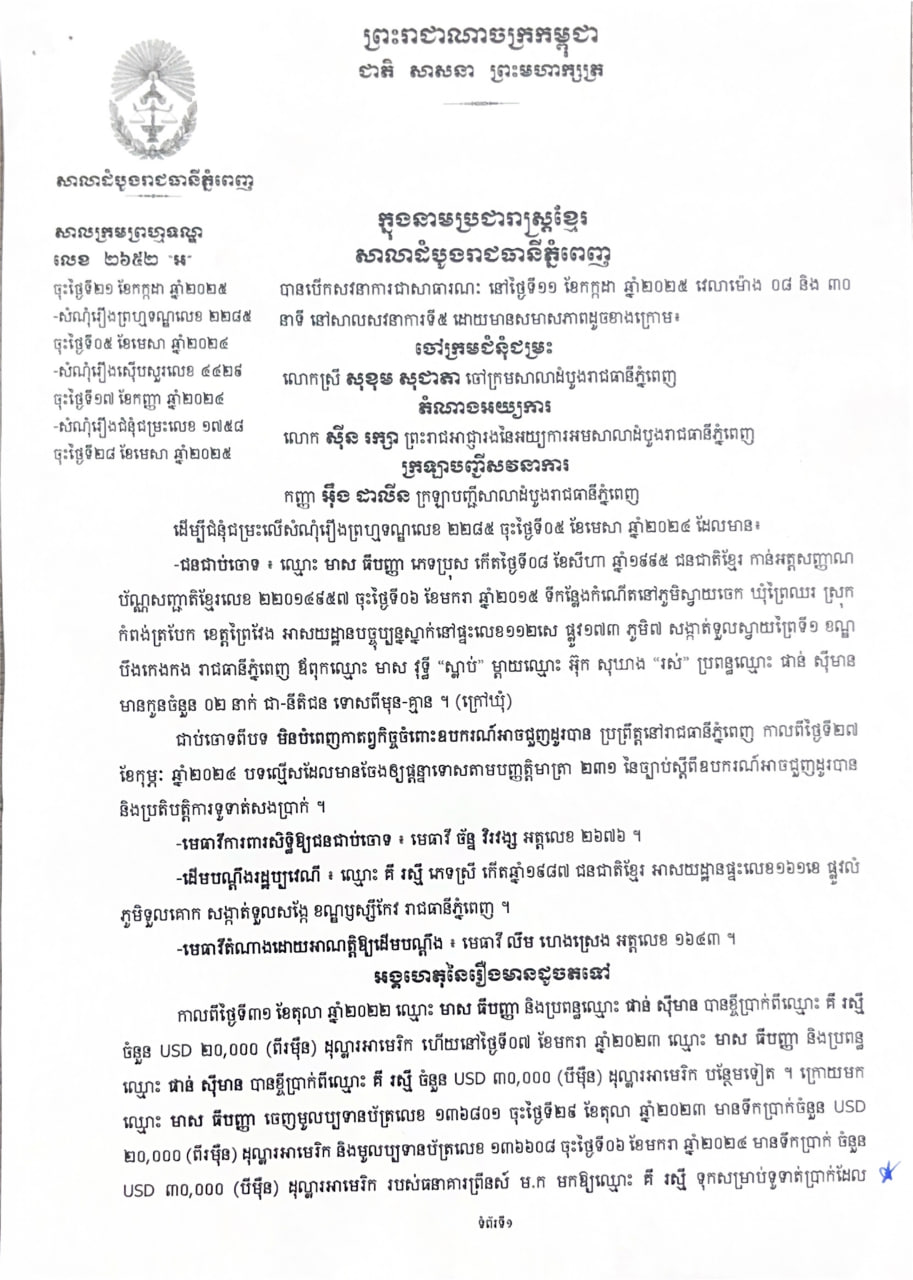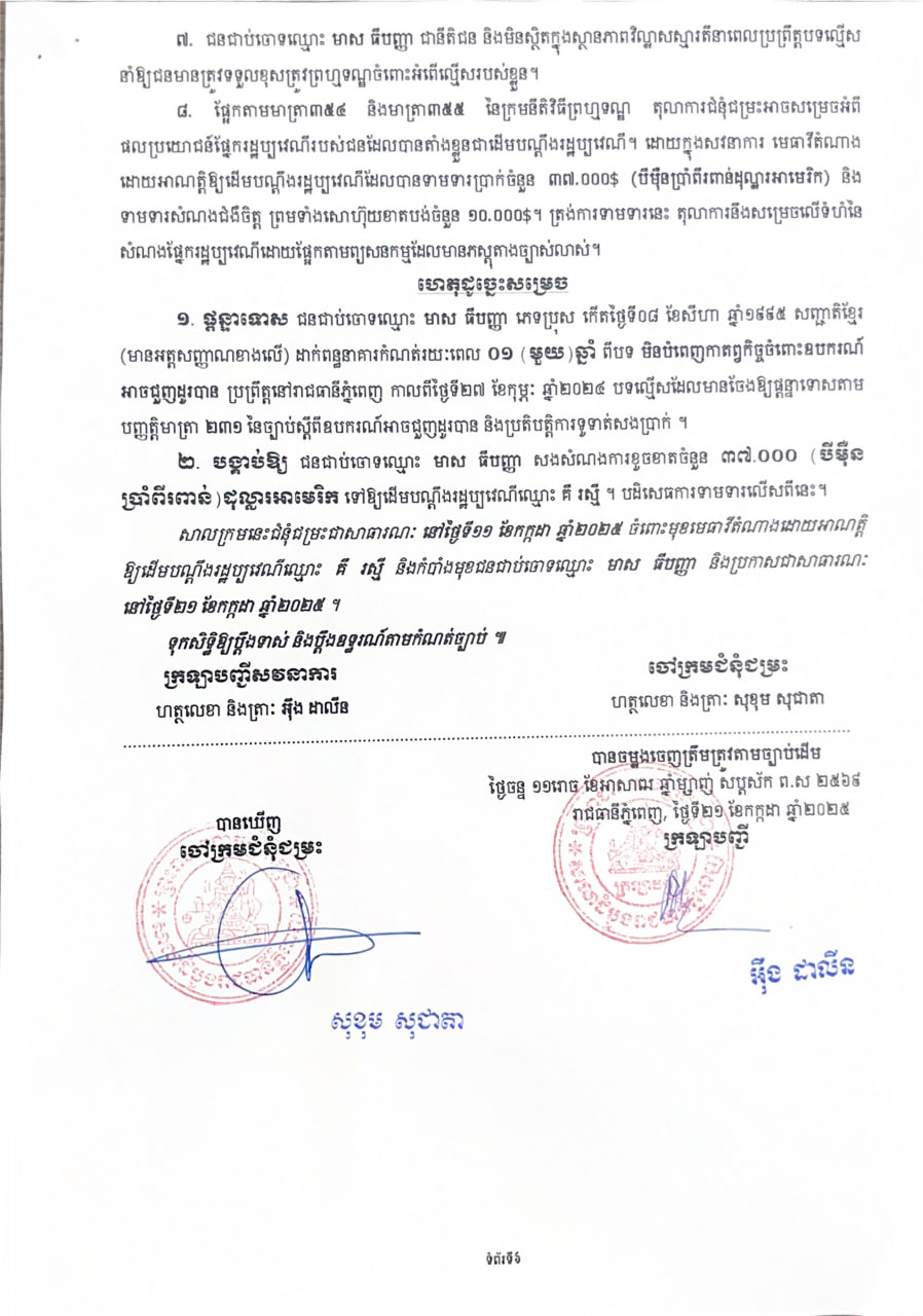 (ភ្នំពេញ)៖ ចៅក្រមសាលាដំបូងរាជធានីភ្នំពេញ បានចេញសាលក្រម ផ្តន្ទាទោស ជនជាប់ចោទឈ្មោះ មាស ធីបញ្ញា ភេទប្រុស កើតថ្ងៃទី០៨ ខែសីហា ឆ្នាំ១៩៩៥ សញ្ជាតិខ្មែរ ដាក់ពន្ធនាគារកំណត់រយៈពេល ១ឆ្នាំ ពីបទ មិនបំពេញកាតព្វកិច្ចចំពោះឧបករណ៍ អាចជួញដូរបាន ប្រព្រឹត្តនៅរាជធានីភ្នំពេញ កាលពីថ្ងៃទី២៧ ខែកុម្ភៈ ឆ្នាំ២០២៤ បទល្មើសដែលមានចែងឱ្យផ្តន្ទាទោសតាម បញ្ញត្តិមាត្រា២៣១ នៃច្បាប់ស្តីពីឧបករណ៍អាចជួញដូរបាន និងប្រតិបត្តិការទូទាត់សងប្រាក់។ ជាមួយគ្នានេះ ចៅក្រមសាលាដំបូងរាជធានីភ្នំពេញ បានបង្គាប់ឱ្យជនជាប់ចោទឈ្មោះ មាស ធីបញ្ញា សងសំណងការខូចខាតចំនួន ៣៧.០០០ (បីម៉ឺន ប្រាំពីរពាន់) ដុល្លារអាមេរិក ទៅឱ្យដើមបណ្តឹងរដ្ឋប្បវេណីឈ្មោះ គឺ រស្មី៕