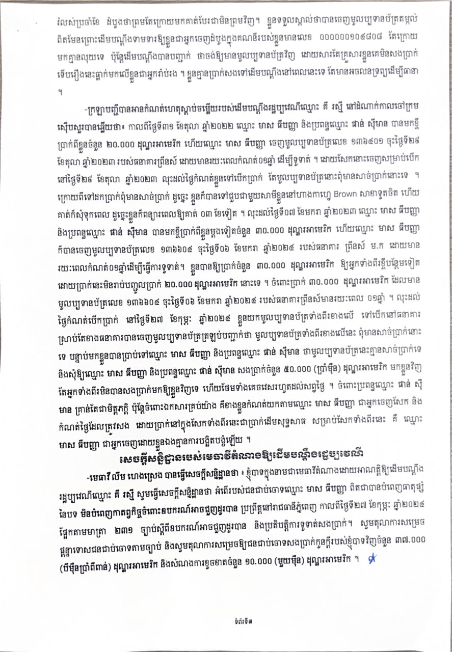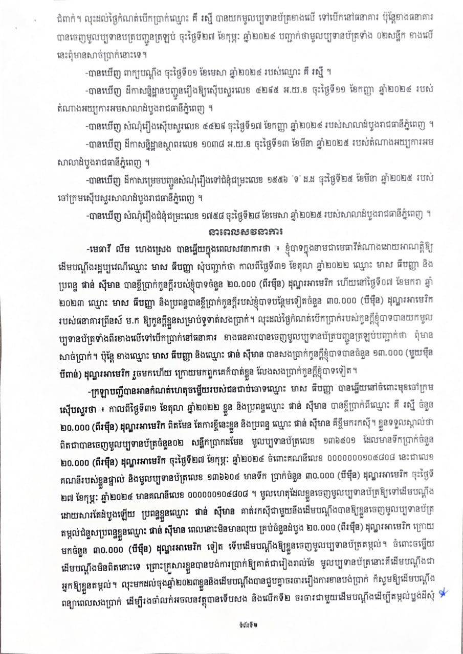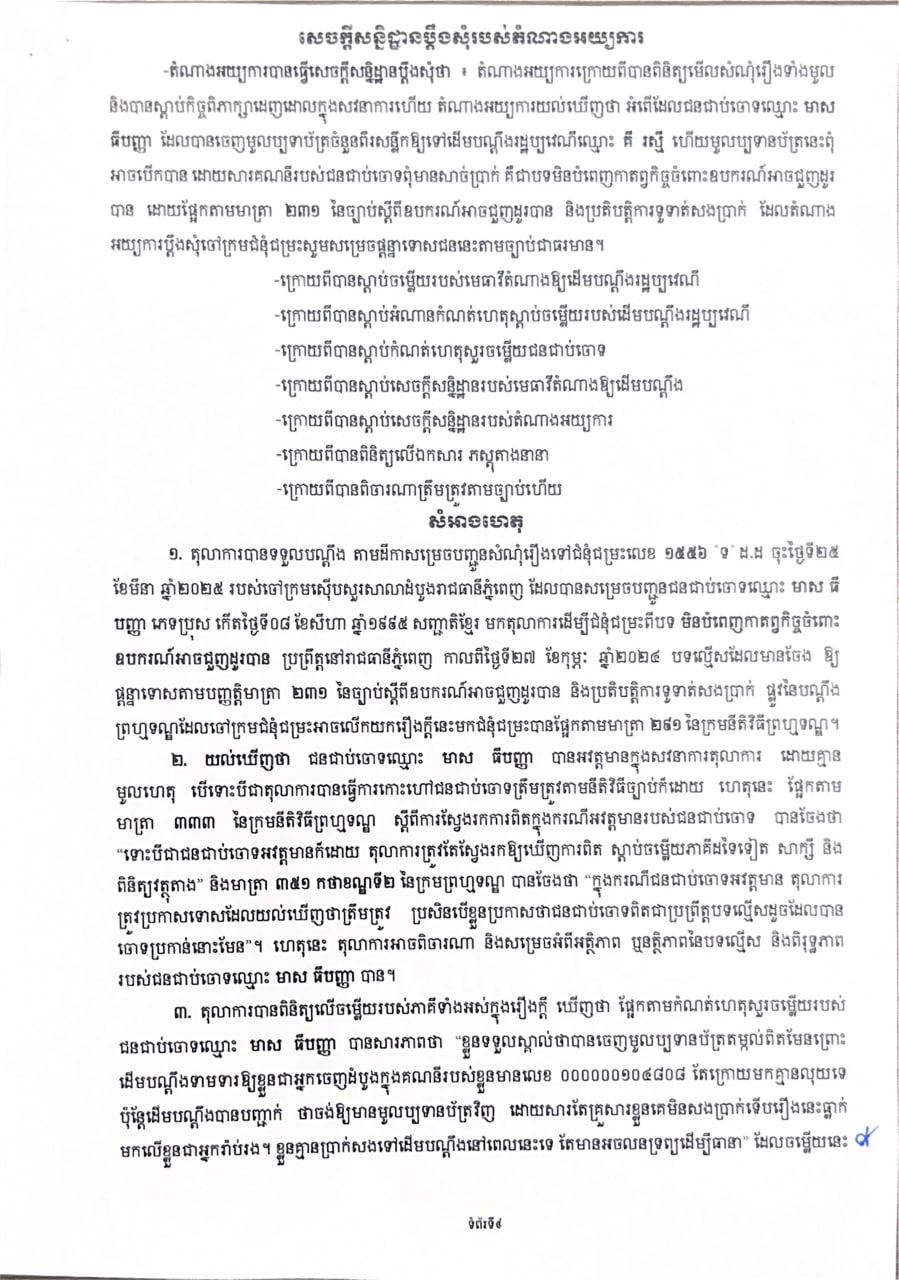 សាលាដំបូងរាជធានីភ្នំពេញ ផ្តន្ទាទោសជនជាប់ចោទឈ្មោះ មាស ធីបញ្ញា ដាក់ពន្ធនាគារ ១ឆ្នាំ ពីបទ មិនបំពេញកាតព្វកិច្ចចំពោះឧបករណ៍ អាចជួញដូរបាន