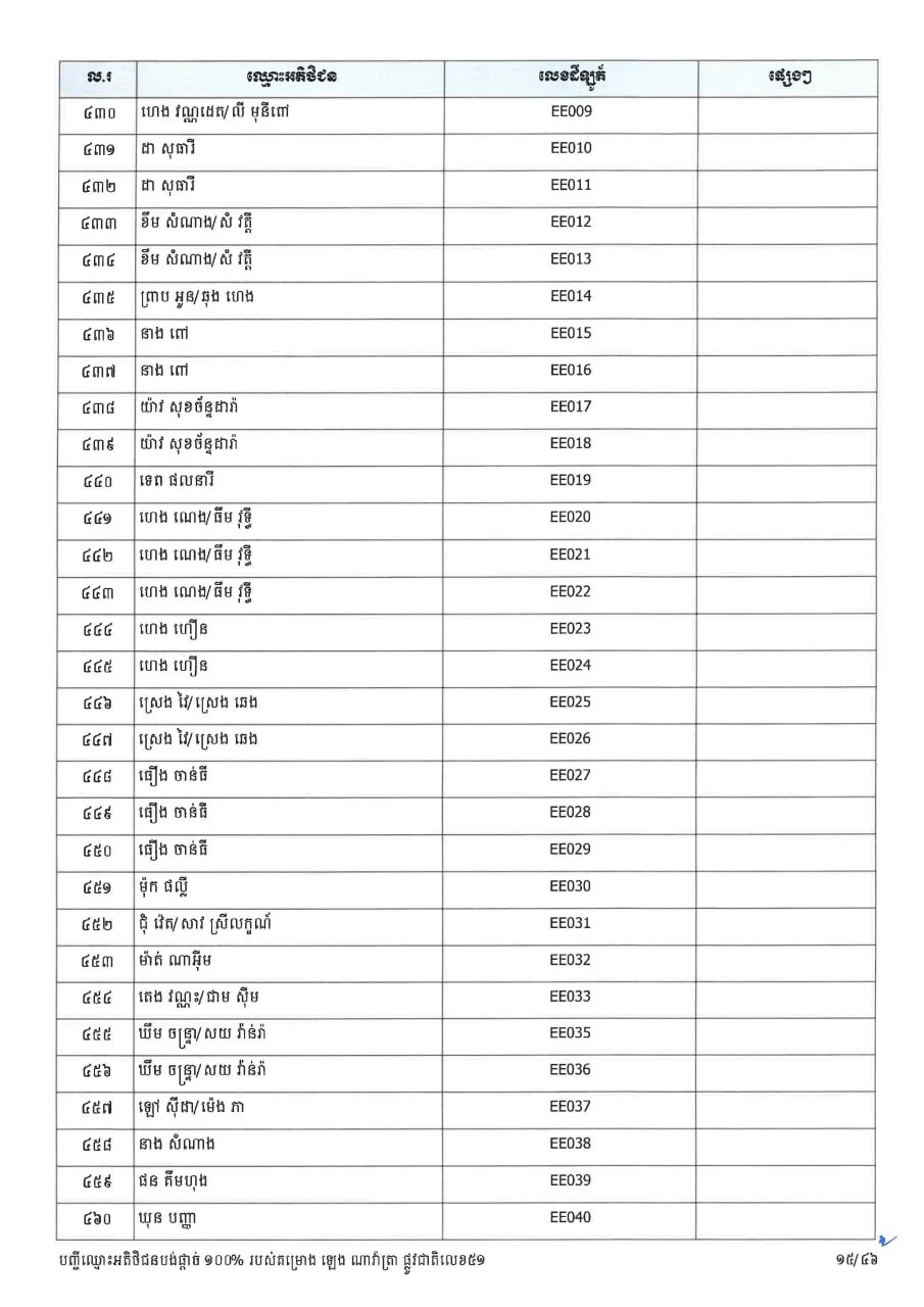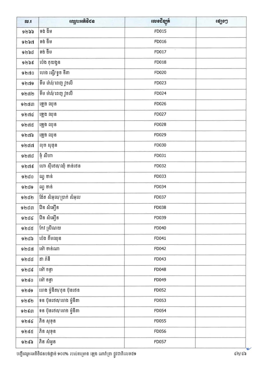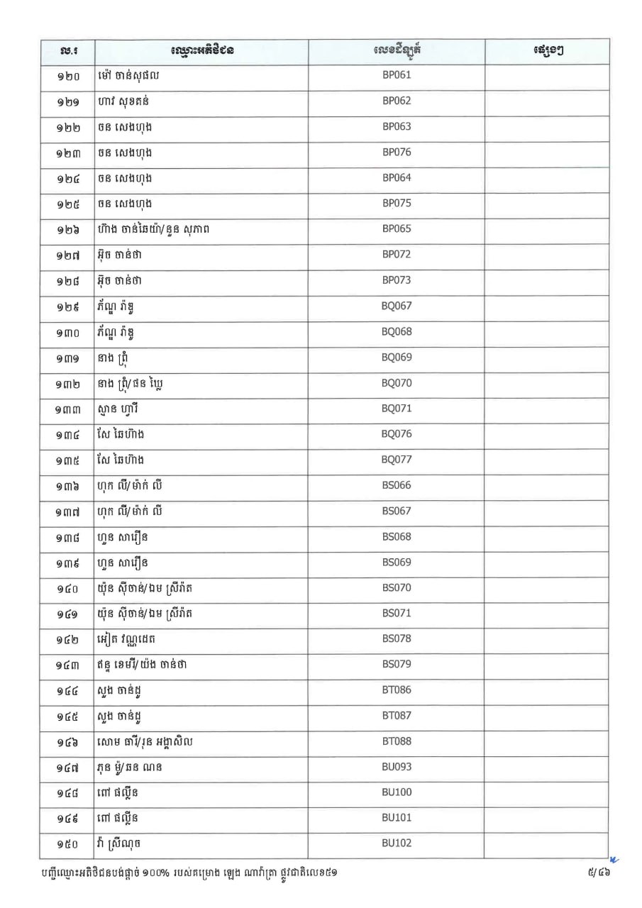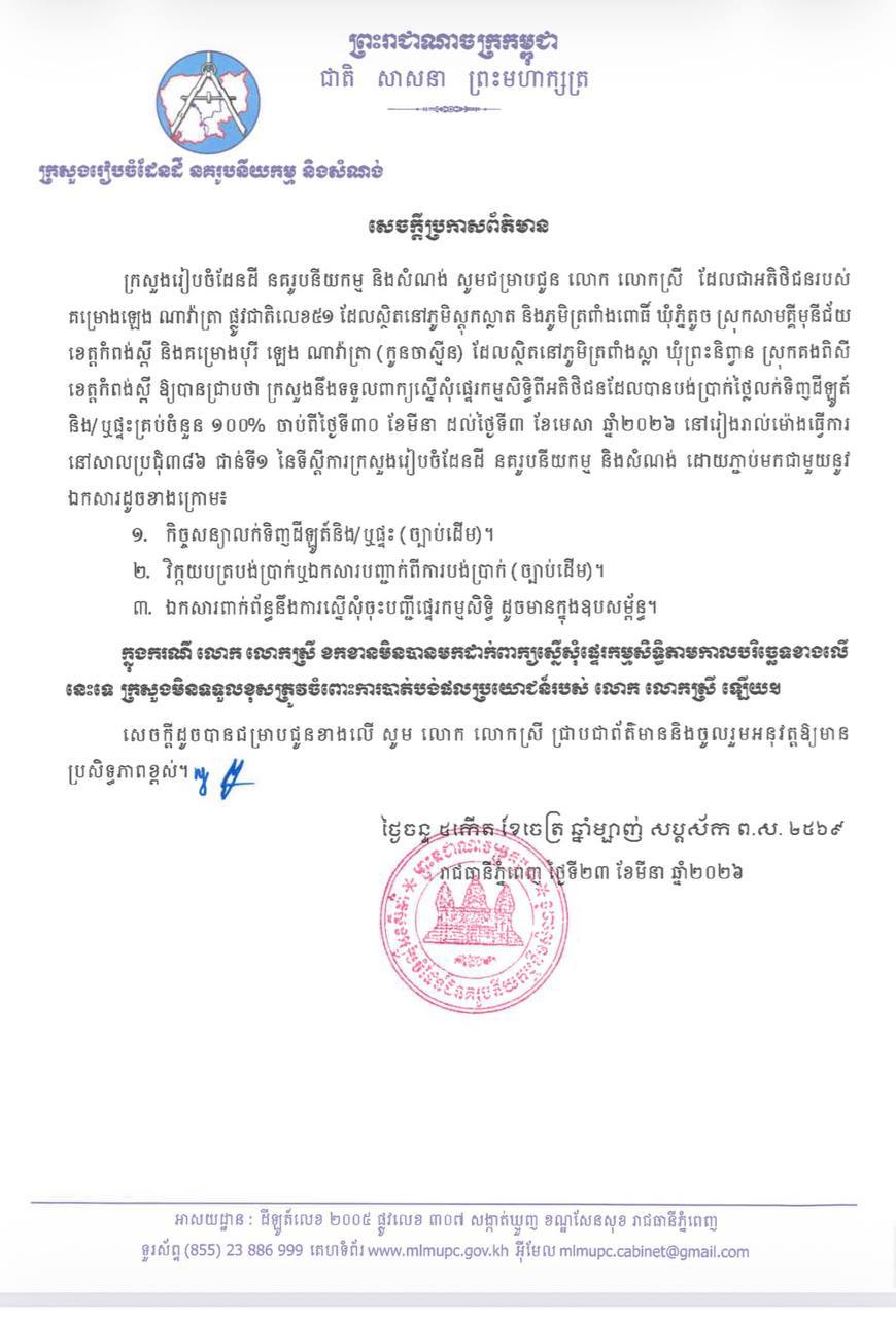 (ភ្នំពេញ)៖ ក្រសួងរៀបចំដែនដី នគរូបនីយកម្ម និងសំណង់ នាថ្ងៃទី២៣ ខែមីនា ឆ្នាំ២០២៦នេះ បានចេញសេចក្តីប្រកាសព័ត៌មាន ជម្រាបជូនអតិថិជនទាំងអស់របស់គម្រោង ឡេង ណាវ៉ាត្រា ផ្លូវជាតិលេខ៥១ ដែលមានទីតាំងស្ថិតនៅភូមិស្លុកស្លាត និងភូមិត្រពាំងពោធ៍ ឃុំភ្នំតូច ស្រុកសាមគ្គីមុនីជ័យ ខេត្តកំពង់ស្ពឺ និងគម្រោង ឡេង ណាវ៉ាត្រា (Jasmine) ដែលស្ថិតនៅភូមិត្រពាំងស្លា ឃុំព្រះនិព្វាន ស្រុកគងពិសី ខេត្តកំពង់ស្ពឺ ឲ្យជ្រាបថា ក្រសួងនឹងបន្តទទួលពាក្យស្នើសុំផ្ទេរកម្មសិទ្ធ អតិថិជនដែលបង់ប្រាក់ថ្លៃលក់ទិញដីឡូត៍ និងផ្ទះគ្រប់ចំនួន ១០០%។