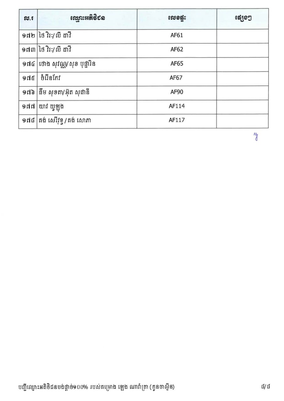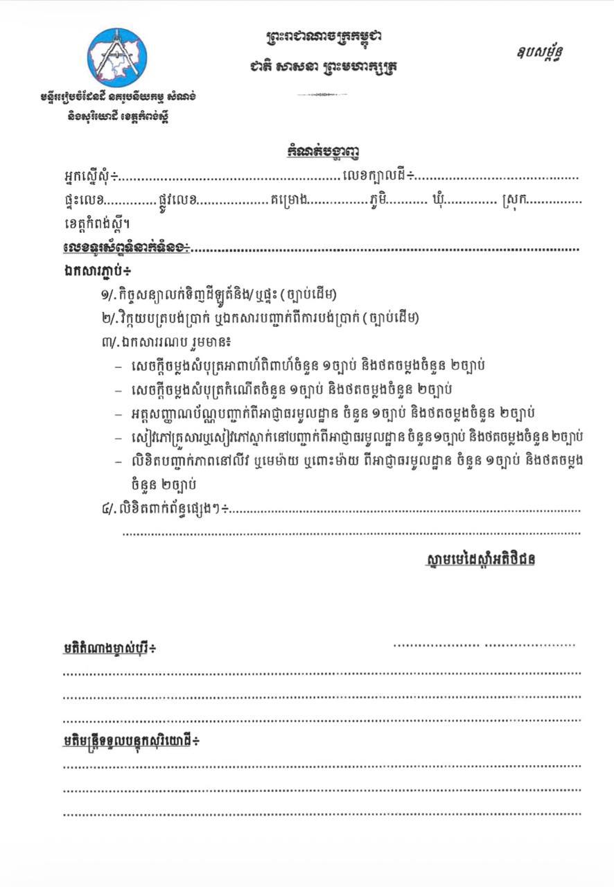 ការបន្តទទួលពាក្យស្នើសុំផ្ទេរកម្មសិទ្ធ ជូនអតិថិជនទាំងពីរគម្រោងខាងលើនេះ នឹងធ្វើឡើងចាប់ពីថ្ងៃទី៣០ ខែមីនា ឆ្នាំ២០២៦ រហូតដល់ថ្ងៃទី៣ ខែមេសា ឆ្នាំ២០២៦ ចាប់ពីម៉ោង ៨៖៣០នាទីព្រឹក រហូតដល់ម៉ោង ៥៖០០នាទីល្ងាច នៅសាលប្រជុំ៣៨៦ ជាន់ទី១ នៃទីស្នីការក្រសួងរៀបចំដែនដី នគរូបនីយកម្ម សំណង់ ដោយភ្ជាប់មកជាមួយនូវឯកសារដូចខាងក្រោម៖