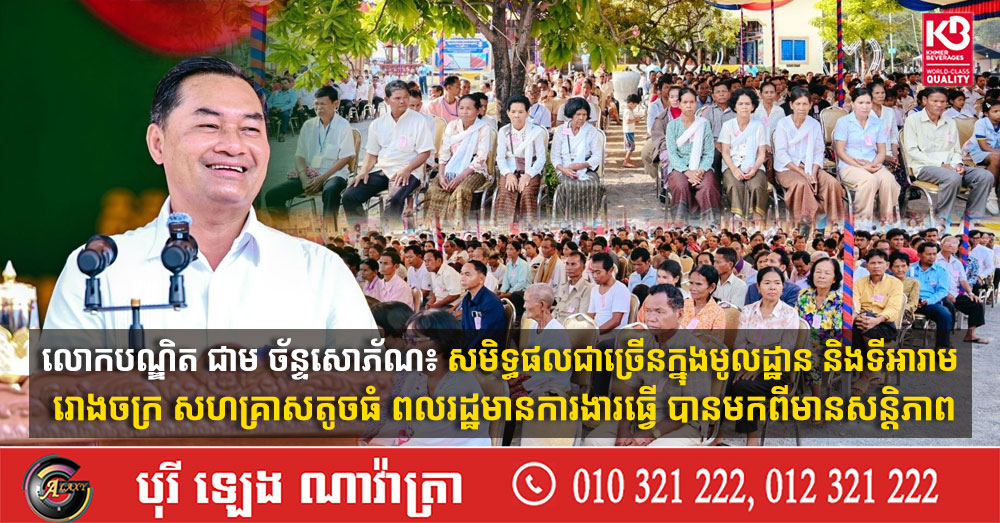 លោកបណ្ឌិត ជាម ច័ន្ទសោភ័ណ៖ សមិទ្ធផលជាច្រើនក្នុងមូលដ្ឋាន និងទីអារាម រោងចក្រ សហគ្រាសតូចធំ ពលរដ្ឋមានការងារធ្វើ បានមកពីមានសន្តិភាព