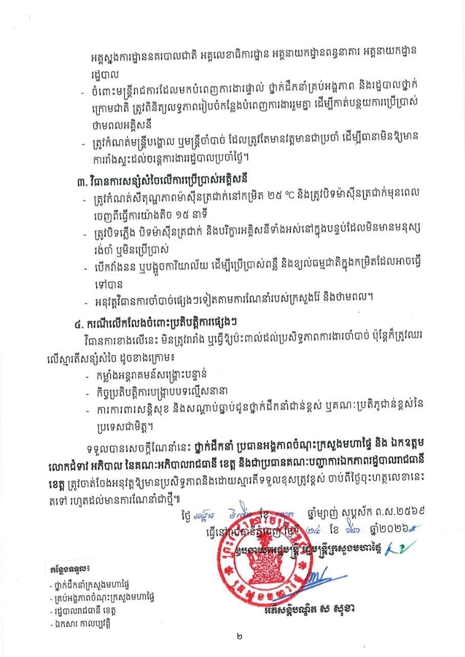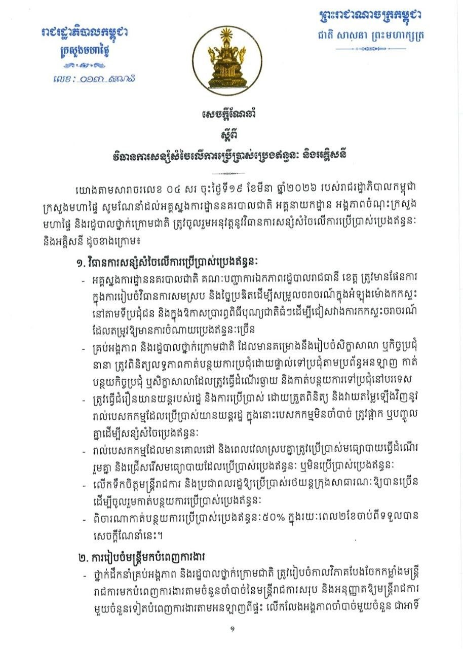 (ភ្នំពេញ)៖ ក្រសួងមហាផ្ទៃ នៅថ្ងៃទី២៤ ខែមីនា ឆ្នាំ២០២៦នេះ បានចេញសេចក្ដីណែនាំដល់អគ្គស្នងការដ្ឋាននគរបាលជាតិ អគ្គនាយកដ្ឋាន អង្គភាពចំណុះក្រសួងមហាផ្ទៃ និងរដ្ឋបាលថ្នាក់ក្រោមជាតិ ត្រូវចូលរួមអនុវត្តនូវវិធានការសន្សំសំចៃលើការប្រើប្រាស់ប្រេងឥន្ធនៈ និងអគ្គិសនី។