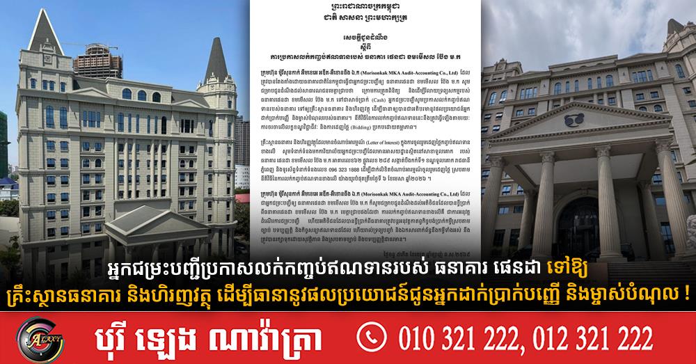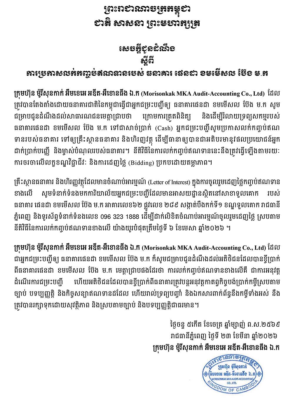 (ភ្នំពេញ)៖ ក្រុមហ៊ុន ម៉ូរីសុនកាក់ អឹមខេអេ អឌីត-អឹខោនធីង ឯ.ក (Morisonkak MKA Audit-Accounting Co., Ltd) ដែលត្រូវបានតែងតាំងដោយធនាគារជាតិនៃកម្ពុជាធ្វើជាអ្នកជម្រះបញ្ជីឲ្យធនាគារផេនដា ខមមើសល ប៊ែង ម.ក នៅថ្ងៃទី២៤ ខែមីនា ឆ្នាំ២០២៦នេះ បានចេញសេចក្តីជូនដំណឹង ពីការប្រកាសលក់កញ្ចប់ឥណទានរបស់ធនាគារ ទៅឲ្យគ្រឹះស្ថានធនាគារ និងហិរញវត្ថុ ដើម្បីធានាឲ្យបានជាអតិបរមានូវផលប្រយោជន៍អ្នកដាក់ប្រាក់បញ្ញើ និងម្ចាស់បំណុលរបស់ធនាគារ។