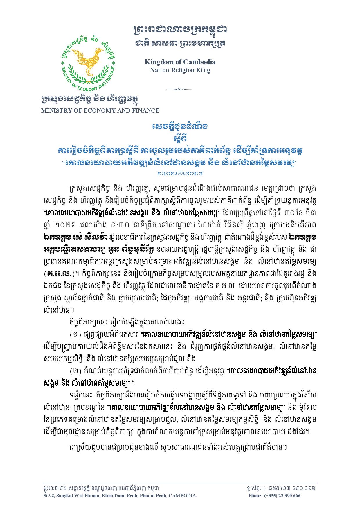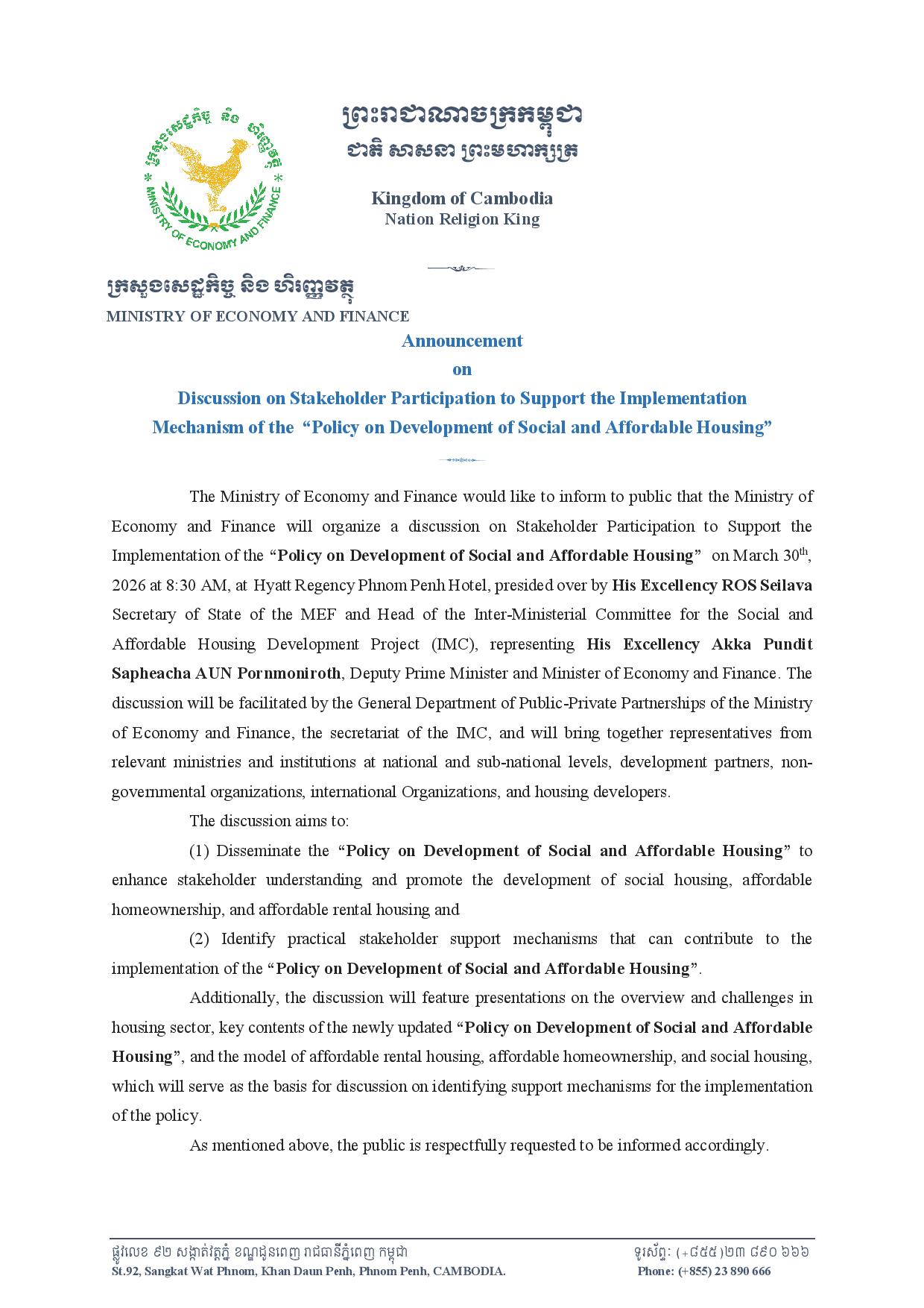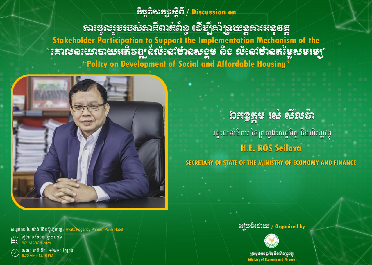 (ភ្នំពេញ)៖ ក្រសួងសេដ្ឋកិច្ច និង ហិរញ្ញវត្ថុ នឹងរៀបចំកិច្ចប្រជុំពិភាក្សាស្តីពីការចូលរួមរបស់ភាគីពាក់ព័ន្ធ ដើម្បីគាំទ្រយន្តការអនុវត្ត «គោលនយោបាយអភិវឌ្ឍន៍លំនៅឋានសង្គម និង លំនៅឋានតម្លៃសមរម្យ» ដែលប្រព្រឹត្តទៅនៅថ្ងៃទី ៣០ ខែមីនា ឆ្នាំ២០២៦ វេលាម៉ោង ៨៖៣០ នាទីព្រឹក នៅសណ្ឋាគារ ហៃយ៉ាត់ រីជិនស៊ី ភ្នំពេញ ក្រោមអធិបតីភាពលោក រស់ សីលវ៉ា រដ្ឋលេខាធិការ នៃក្រសួងសេដ្ឋកិច្ច និង ហិរញ្ញវត្ថុ ជាតំណាងដ៏ខ្ពង់ខ្ពស់របស់ អគ្គបណ្ឌិតសភាចារ្យ អូន ព័ន្ធមុនីរ័ត្ន ឧបនាយករដ្ឋមន្ត្រី រដ្ឋមន្ត្រីក្រសួងសេដ្ឋកិច្ច និង ហិរញ្ញវត្ថុ និង ជាប្រធានគណៈកម្មាធិការអន្តរក្រសួងសម្រាប់គម្រោងអភិវឌ្ឍន៍លំនៅឋានសង្គម និង លំនៅឋានតម្លៃសមរម្យ (គ.អ.ល.)។