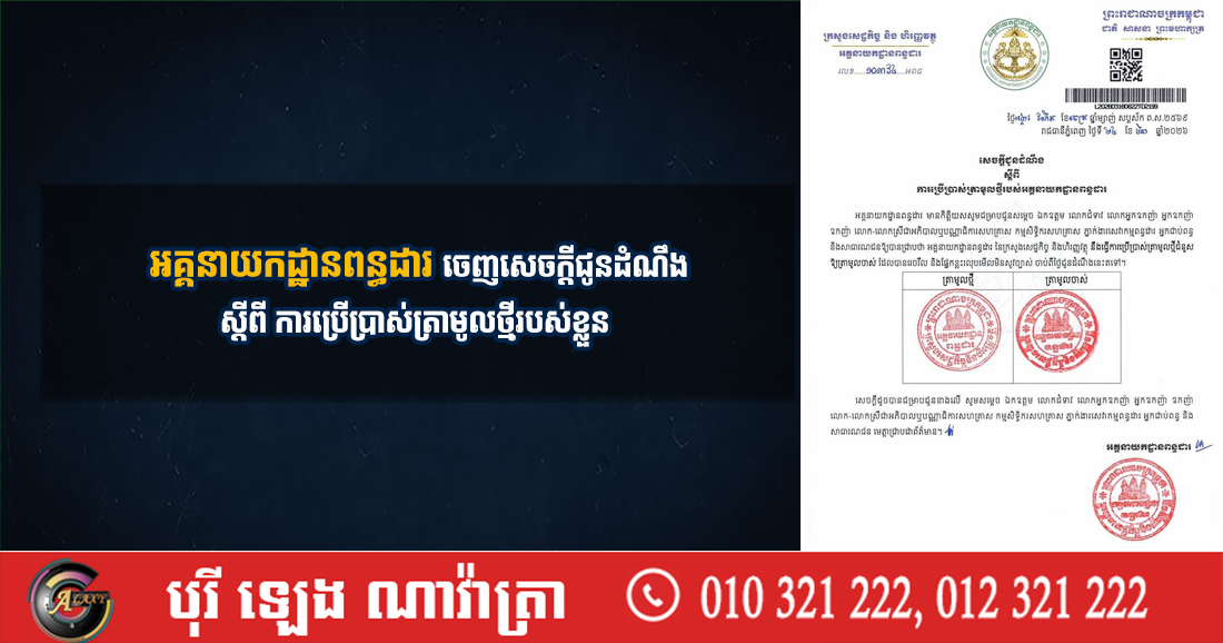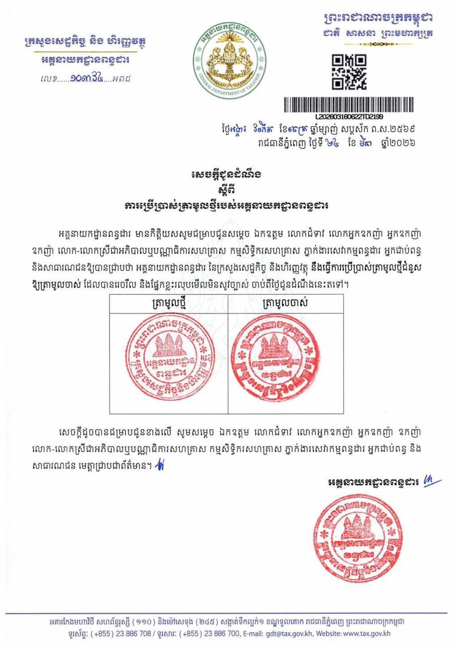 (ភ្នំពេញ)៖ អគ្គនាយកដ្ឋានពន្ធដារ នៅថ្ងៃទី២៤ ខែមីនា ឆ្នាំ២០២៦នេះ បានចេញសេចក្តីជូនដំណឹង ស្តីពី ការប្រើប្រាស់ត្រាមូលថ្មីរបស់ខ្លួន។