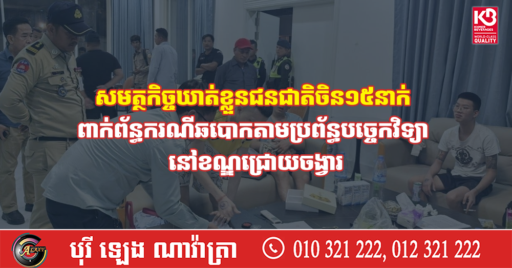 សមត្ថកិច្ចឃាត់ខ្លួនជនជាតិចិន១៥នាក់ ពាក់ព័ន្ធករណីឆបោកតាមប្រព័ន្ធបច្ចេកវិទ្យា នៅខណ្ឌជ្រោយចង្វារ