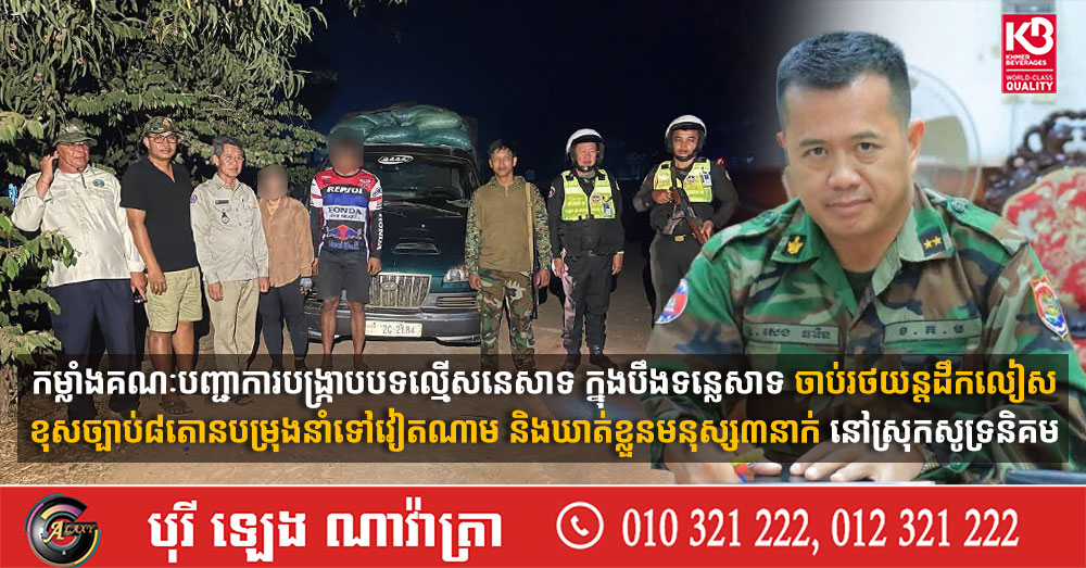 កម្លាំងគណៈបញ្ជាការបង្ក្រាបបទល្មើសនេសាទ ក្នុងបឹងទន្លេសាទ ចាប់រថយន្ដដឹកលៀសខុសច្បាប់៨តោនបម្រុងនាំទៅវៀតណាម និងឃាត់ខ្លួនមនុស្ស៣នាក់ នៅស្រុកសូទ្រនិគម