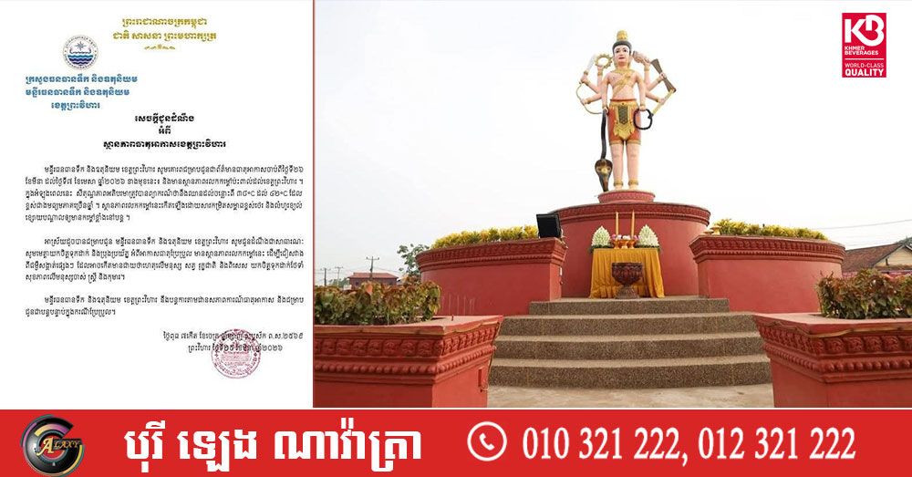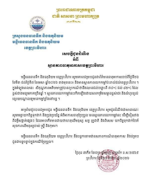 មន្ទីរធនធានទឹកខេត្តព្រះវិហារ ជូនដំណឹងពីអាកាសធាតុឡើងកម្តៅ ចាប់ពីចុងខែមីនា ដល់ដើមខែមេសា និងអំពាវនាវឱ្យប្រជាពលរដ្ឋទូទាំងខេត្ត ត្រូវមានការប្រុងប្រយ័ត្នខ្ពស់