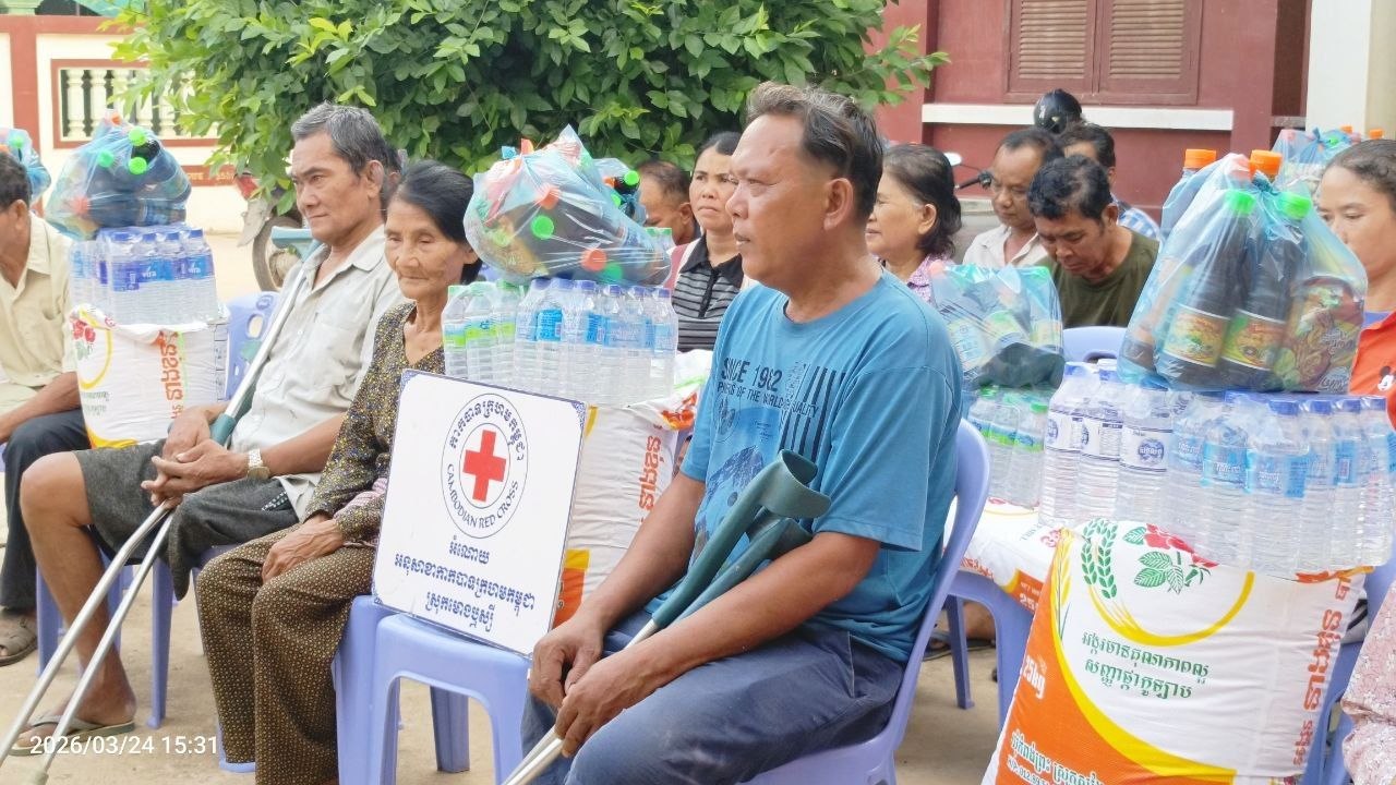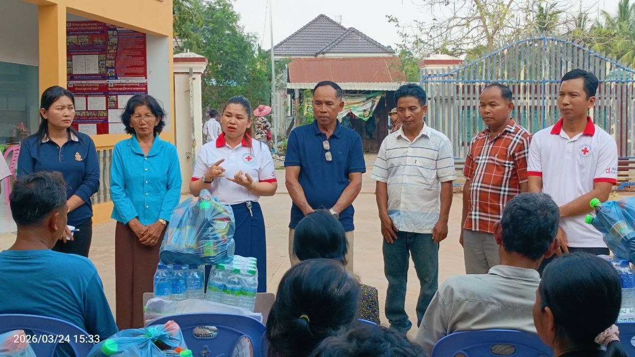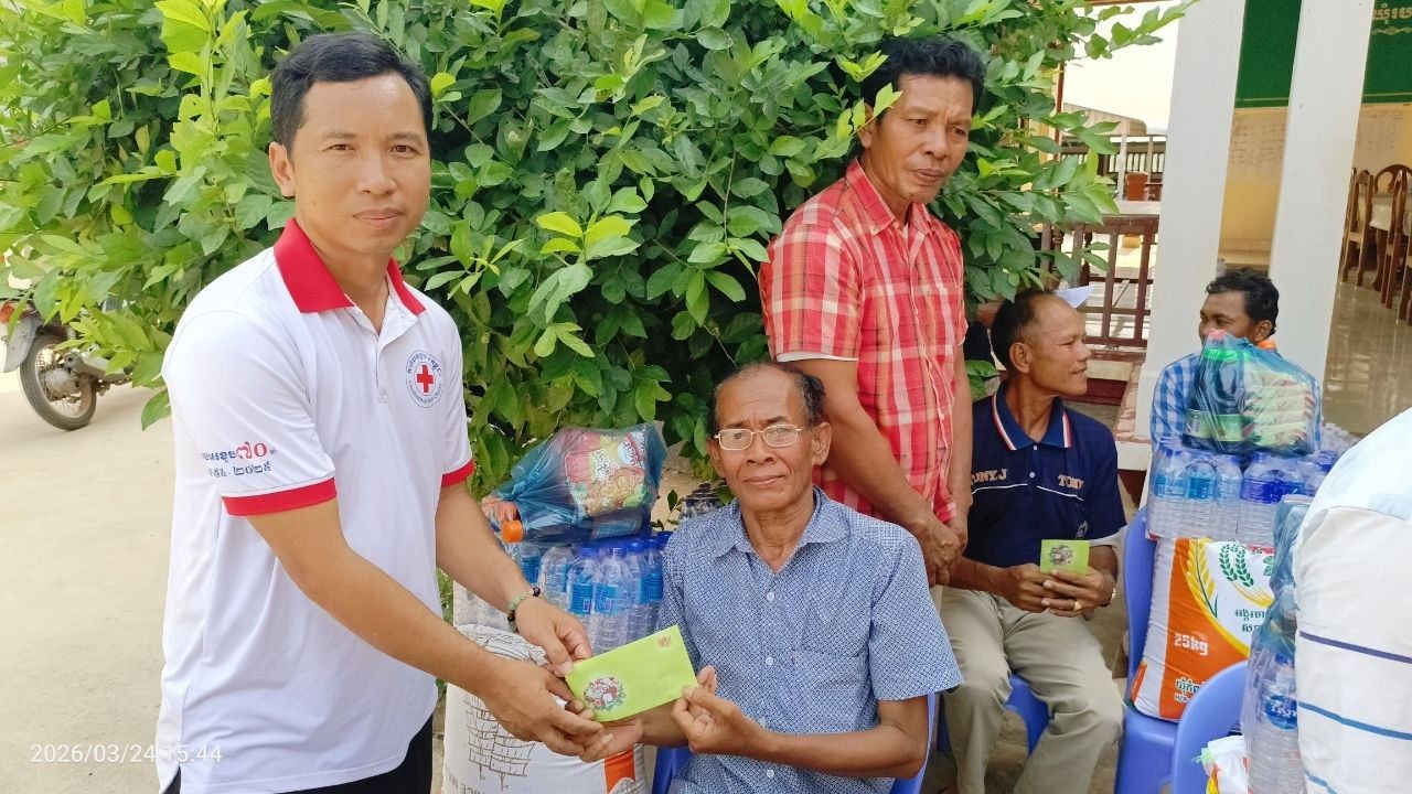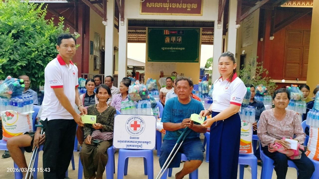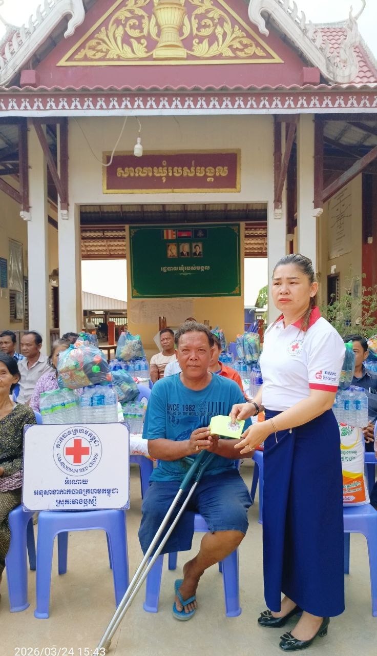(បាត់ដំបង)៖ ក្រុមការងារអនុសាខាកាកបាទក្រហមកម្ពុជាស្រុកមោងឬស្សី ដែលមានលោក ទេព ហន ជាប្រធាន នៅព្រឹកថ្ងៃទី២៤ ខែមីនា ឆ្នាំ២០២៦ បានចាត់ក្រុមការងារដឹកនាំដោយលោកស្រី លឹម រដ្ឋមុនី អភិបាលរងស្រុក និងជាប្រធានអនុគណៈកម្មាធិការអនុសាខាស្រុក និងសហការីបានចុះសួរសុខទុក្ខ និងនាំយកអំណោយមនុស្សធម៌របស់សប្បុរសជន ផ្តល់ជូនគ្រួសារ ប្រជាពលរដ្ឋងាយរងគ្រោះបំផុត រួមមាន ជនចាស់ជរា ជនមានពិការភាព ស្រ្តីមេម៉ាយ ក្រុមគ្រួសារមកពីគ្រួសារអតីតយុទ្ធជន និងកងទ័ពជួរមុខដែលជួបការលំបាក ក្នុងជីវភាពរស់នៅប្រចាំថ្ងៃចំនួន ២០គ្រួសារ រស់នៅភូមិកូនក្អែក២ ឃុំរបស់មង្គល ស្រុកមោងឫស្សី ខេត្តបាត់ដំបង។