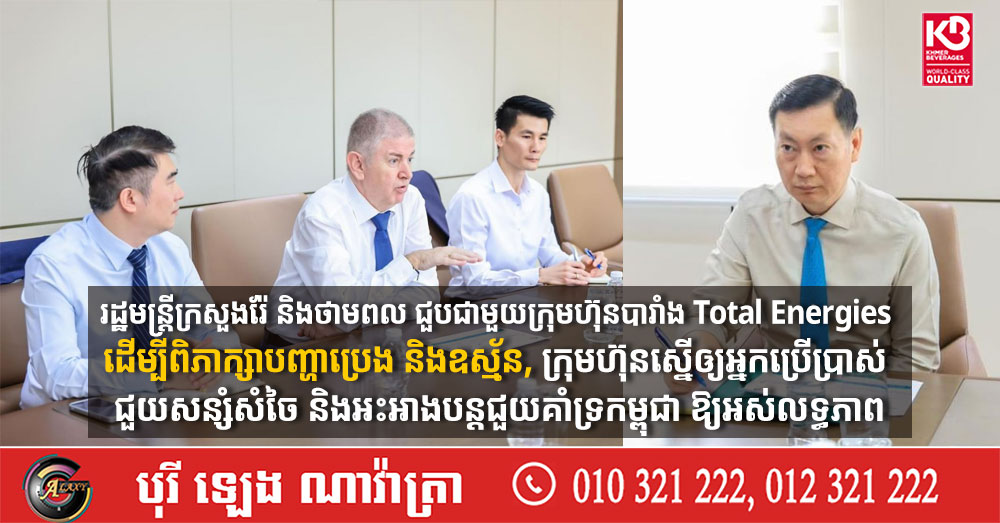 រដ្ឋមន្ដ្រីក្រសួងរ៉ែ និងថាមពល ជួបជាមួយក្រុមហ៊ុនបារាំង Total Energies ដើម្បីពិភាក្សាបញ្ហាប្រេង និងឧស្ម័ន, ក្រុមហ៊ុនស្នើឲ្យអ្នកប្រើប្រាស់ ជួយសន្សំសំចៃ និងអះអាងបន្ដជួយគាំទ្រកម្ពុជា ឱ្យអស់លទ្ធភាព